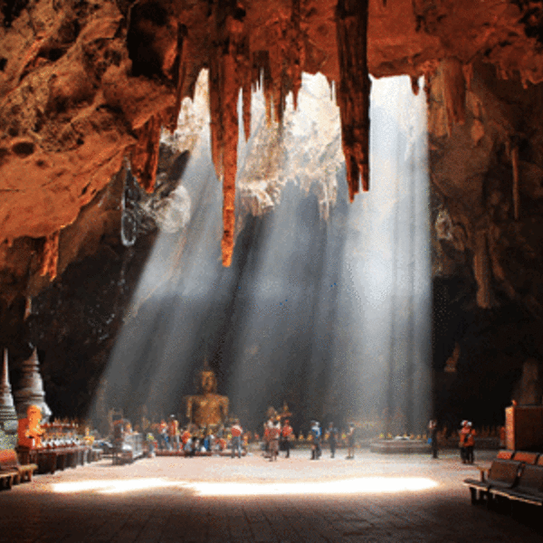 门票在山下售票厅可以买,包含来回的摆渡车费,每人20泰铢。一起爬山吗第三站:KHAOLUANG PHETCHABURI CAVE拷龙穴一起爬山吗?拷龙穴在拷龙山附近,在七岩周边,距离七岩海滩1个小时左右车程,是自然形成的钟乳石洞穴。洞穴深达十几公尺,整个洞内唯一的自然光源是洞穴上方的两个不大...第三站:KHAOLUANG PHETCHABURI CAVE拷龙穴一起爬山吗?拷龙穴在拷龙山附近,在七岩周边,距离七岩海滩1个小时左右车程,是自然形成的钟乳石洞穴。洞穴深达十几公尺,整个洞内唯一的自然光源是洞穴上方的两个不大的裂口,天光穿过上方的树木进入洞中,在空气中形成一束巨大的光路,洒在洞穴内的金佛像上,整个画面让人赞叹不已又肃然起敬。*这里的穿着就需要轻盈方便的裤装,因为需要上下狭窄的台阶。门票在山下售票厅可以买,包含来回的摆渡车费,每人20泰铢。尤其注意的是不能带食物在身上,首饰也要谨慎,因为这里满山的猴子会时刻盯着游客,随时准备抢食物抢包包。传说猴子是洞穴佛像的守护者,一到洞穴口就没有了猴子的踪迹。