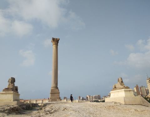 庞培柱耸立在塞拉比尤姆神庙(Temple of Serapeum)的废墟上,需要攀登上100级台阶才能抵达。庞培柱是一根高22米的巨大圆柱,用红色的阿斯旺花岗岩砍凿而成,这就是著名的庞培柱,它赫然耸立在罗哈克提斯(Rhakotis)山丘的遗迹上,亚历山大大帝就是在这里长大的。数个世纪中,庞培柱已经成为亚历山大的主要景点,它的主体是轴状的锥形花岗岩,地基深达2.7米,顶端是精美的科林斯柱头。庞培柱底部的碑铭显示,圆柱建立于公元291年,是用来支撑戴克里先(Diocletian)皇帝的雕像的。 当年的统治者为了传播希腊文化,同时守护埃及文明,创立了塞拉匹斯(Serapis)信仰。“Serapis”一词源自埃及神祗Osirapis,托密勒一世为其添加了希腊诸神的特质,为他的子民缔造了全新的守护神塞拉匹斯,并在罗哈克提斯山丘上建立了塞拉比尤姆神庙。在后来的政教纷争中,神庙惨遭基督徒毁灭。