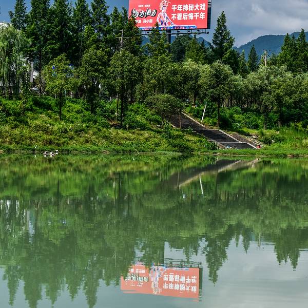 在这条半水半街的商贸街区,除了那些很逼真的仿古街区之外,其实还有这般优美的山水风光,在溪布街的一角来欣赏这美丽的河流其实也是非常养心悦目的。