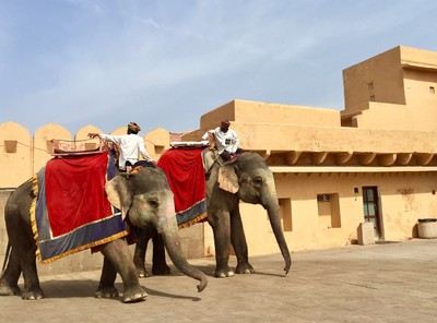 二、琥珀堡游览有骑象参观这个项目,大象头部被装饰得色彩斑斓,从琥珀堡入口处一直载客到顶上。不过看着这些可怜的大象,最后还是放弃了,而且大象在高温下作业也着实可怜,令人心生怜悯。