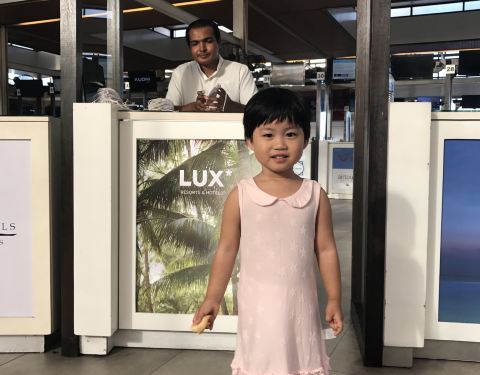 ...还没有等我去拿点儿好吃的,就告知我们可以上飞机了,既兴奋又遗憾,还想多吹吹冷气吃点儿点心水果呢下了飞机拿好行李,然后找酒店对应的服务台了,LUX还是比较醒目的,没有费什么周折我们就找到了,将酒店确认单给小黑看,他就会帮你安排行李的托运,之后带你坐上小汽车到候机大厅。