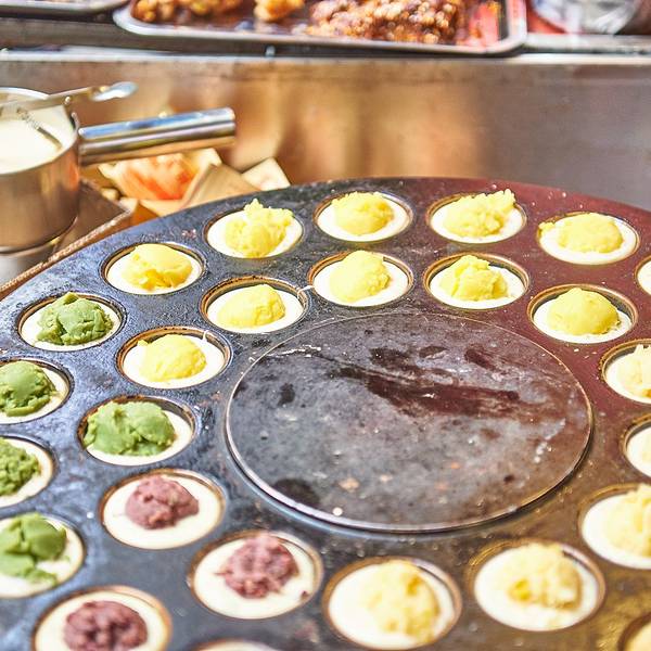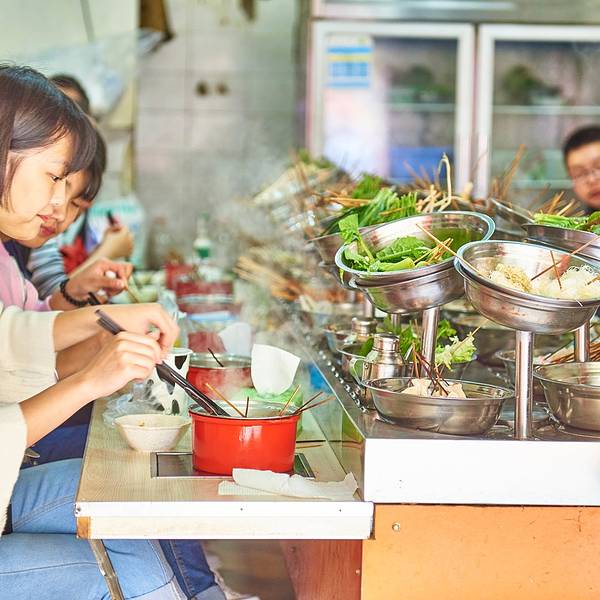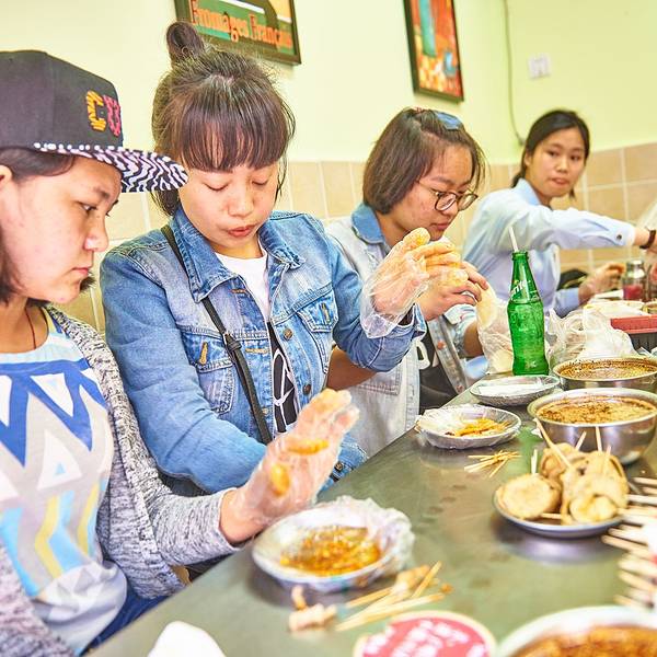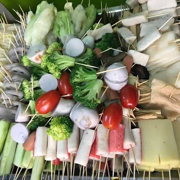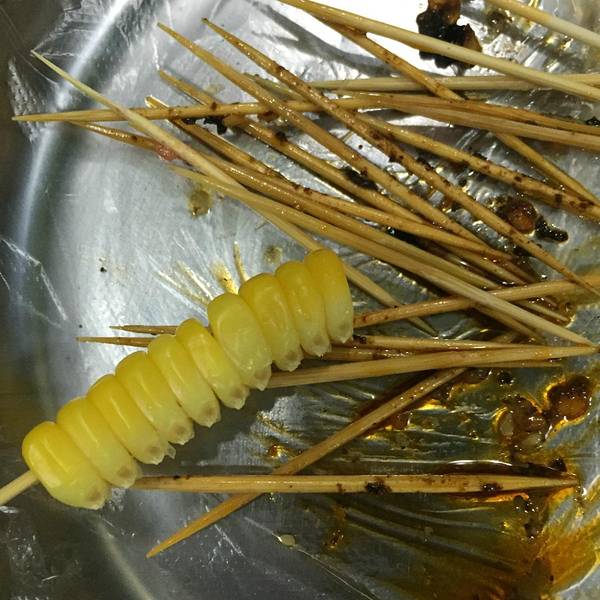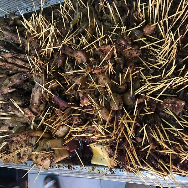 来到了马家巷,一条短短的小吃街,这个叫沾沾。用牙签一个个串起来的,肉类蔬菜类都有