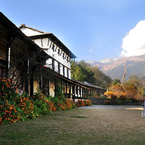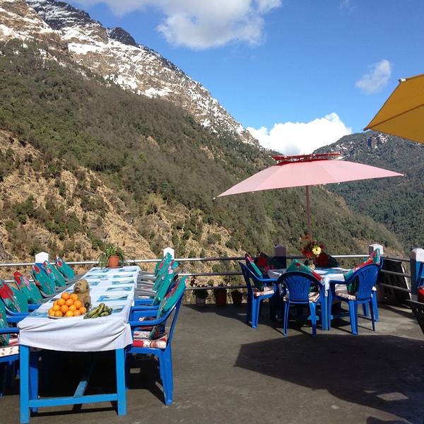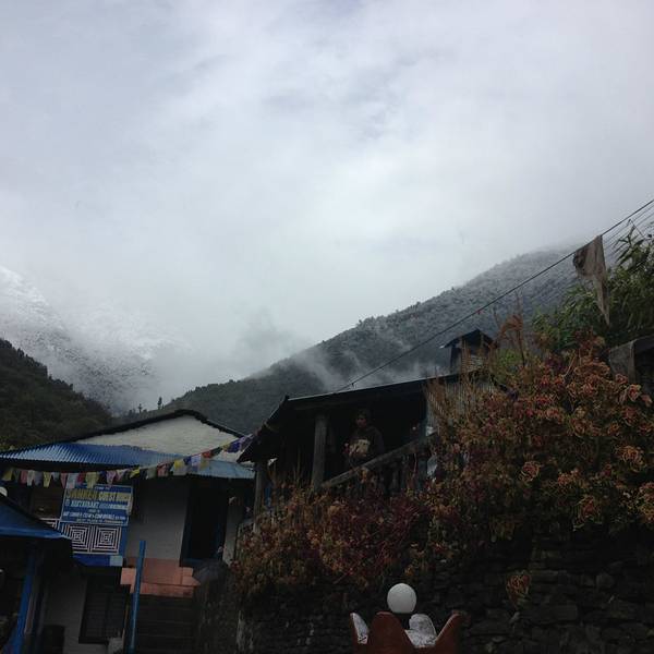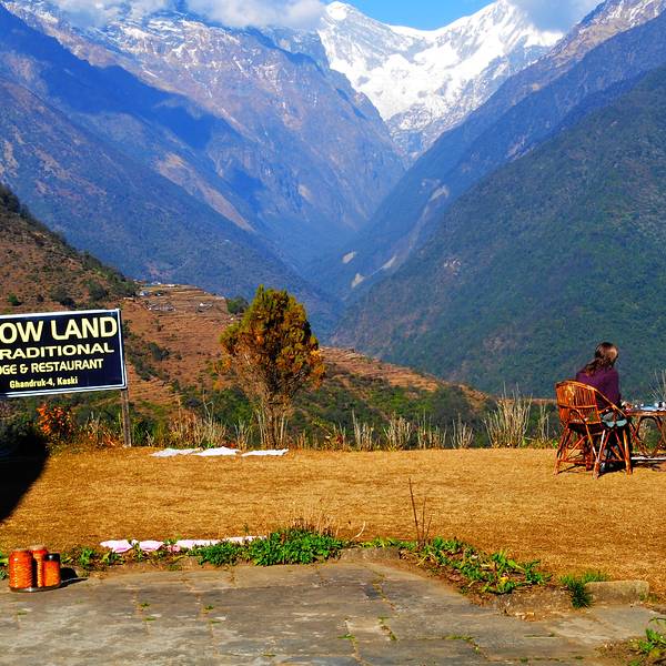 草坪正正对着山,真的风景极好的。 绝对是对我现在的心情最佳描述。可惜晚来了一步,满人了太久没有爬过山的原因我一路喘,心脏都快跳出来了,脑子空空的。每想到今天才是第一天,还有九天就特别绝望。《我的早更女友》里面有一句台词,Tomorrow is another day, but tomorrow is fucking the same. 绝对...太久没有爬过山的原因我一路喘,心脏都快跳出来了,脑子空空的。每想到今天才是第一天,还有九天就特别绝望。《我的早更女友》里面有一句台词,Tomorrow is another day, but tomorrow is fucking the same. 绝对是对我现在的心情最佳描述。爬到Ghandruk的时候腿似乎已经不是我的了。坐下来吃饭头特别疼,就像鼻炎发作最严重的时候。背夫带我们去他熟悉的一家饭馆吃饭,等了将近一个小时,迟来的午饭点了Dal Bhat,425Rs,胃口差极了,饭几乎都是混着水胡乱吞下去。山上的米饭和山下的不一样,口感要差些,很散,没有黏性。