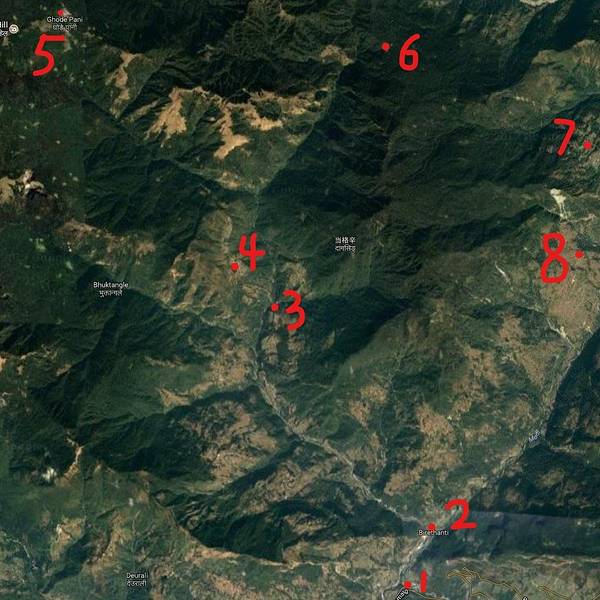 网上找的路线图Google地图截图:1Nayapul,2Birethanti,3Tikhedhunga,4Ulleri,5Ghode Pani,6Tadapani,7Ghandruk,8Ghandruk Bus Park【徒步的一些小Tips】