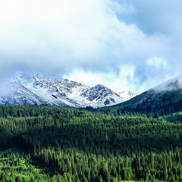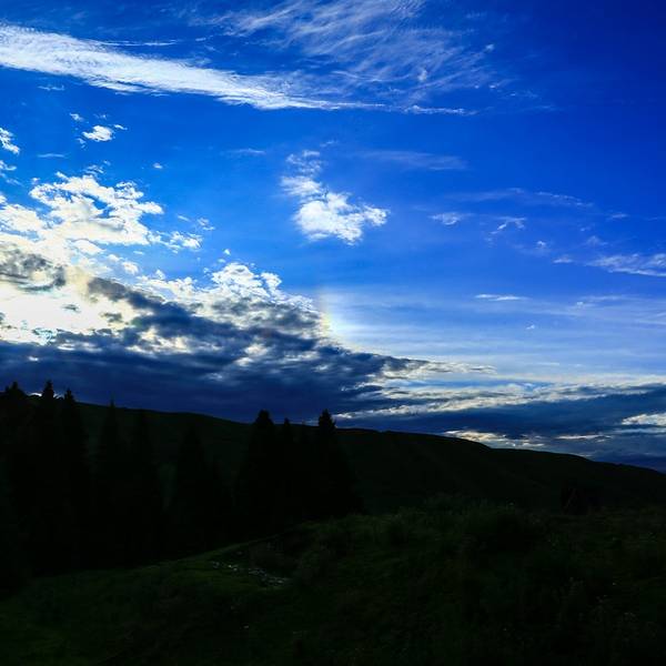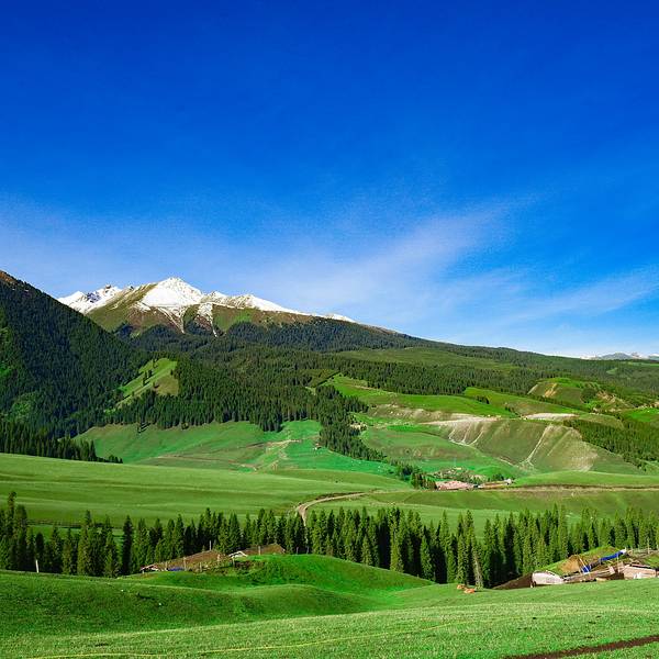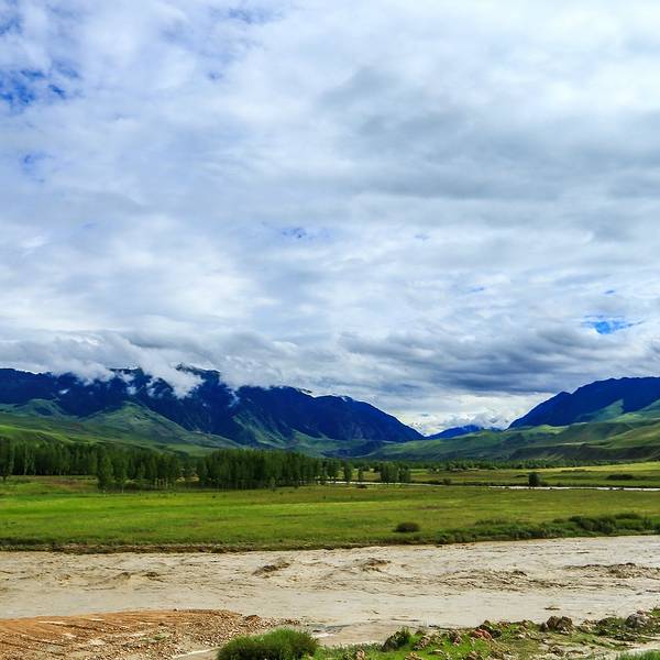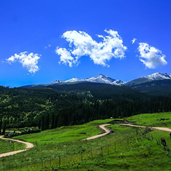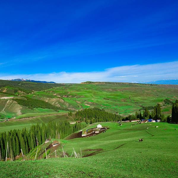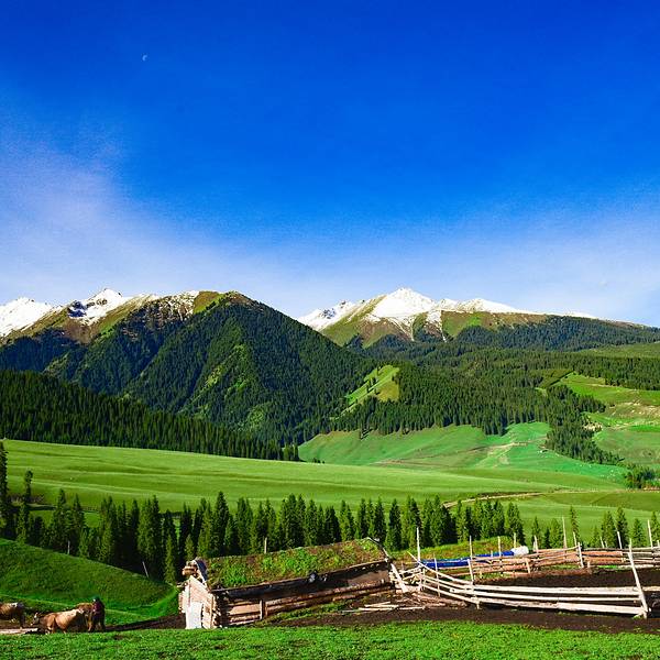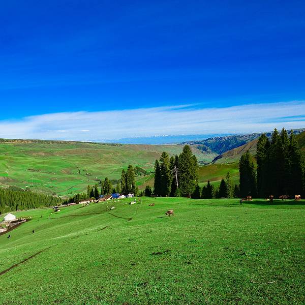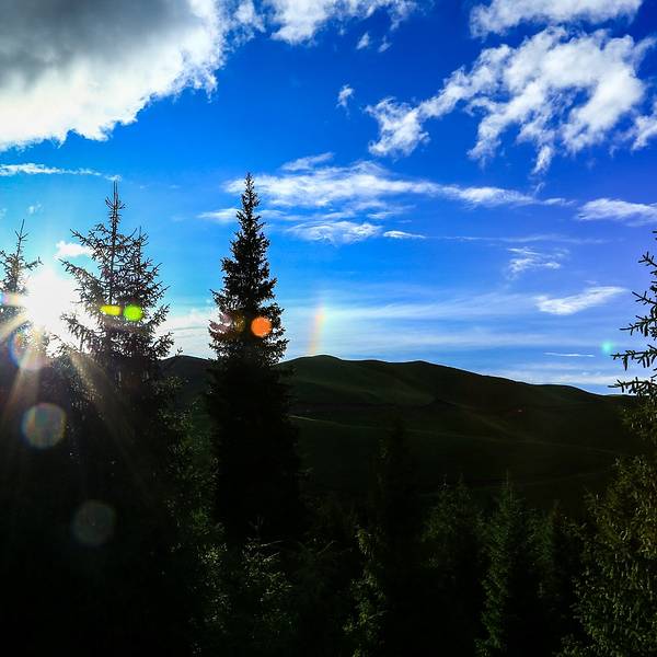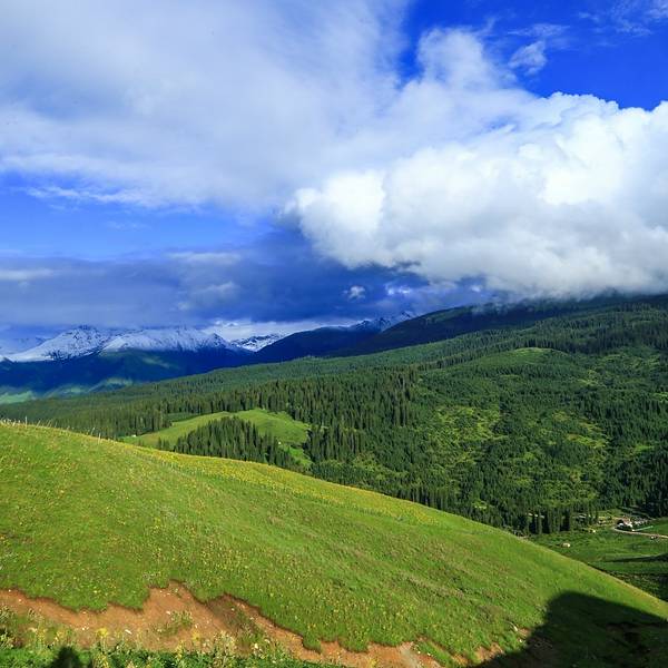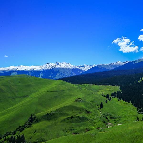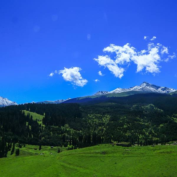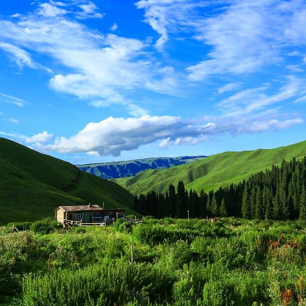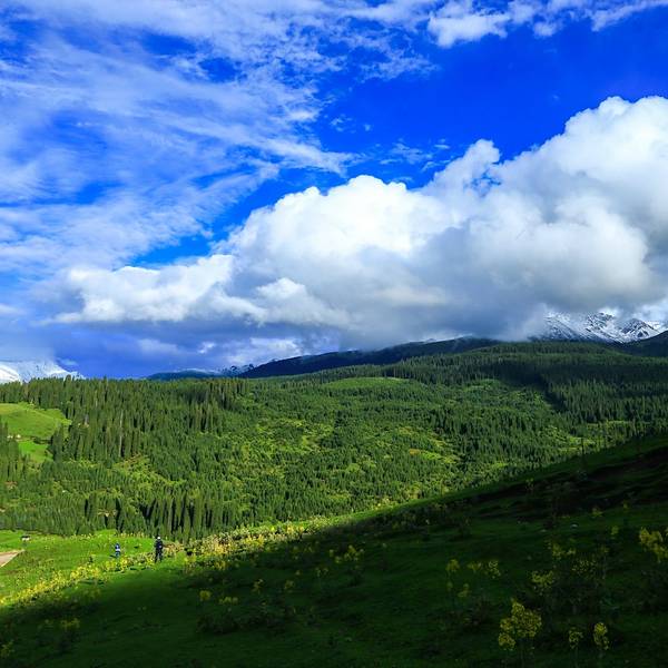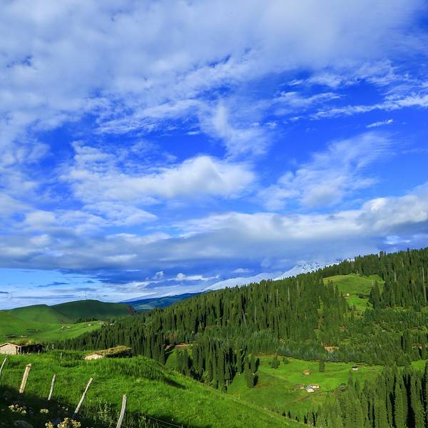 琼库什台沟壑纵横,在草原中颇具阳刚之美,在这里看到蓝天、白云、雪山、墨绿的杉林。