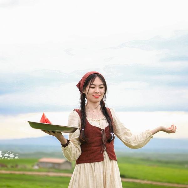 by Seven相机虽然没有好天气,但我们有好心情呀!!!高大哥把带来的西瓜分了一半给牧民,顺便借了个盘子。我们就这样边看夕阳边吃瓜,甜蜜又惬意~~~手托盘子转个圈,他们说像“ 达坂城 的姑娘”🤷🏼♀️