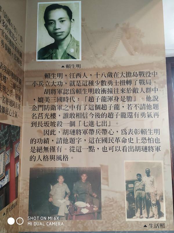 ...为展示馆,楼内有多媒体简介 金门 现状、 金门 建设成果图片、 金门 观光资源介绍与历史文物等下午,我打车到了从宾馆到莒光楼,打表,110元台币。莒光楼是 金门 的标志,也是 金门 的至高点,建造于战争年代的民国41年(1952年),该建筑由花岗岩建造,模仿 北京 角楼模式,城楼的模式也表示遥望大陆中华故...下午,我打车到了从宾馆到莒光楼,打表,110元台币。莒光楼是 金门 的标志,也是 金门 的至高点,建造于战争年代的民国41年(1952年),该建筑由花岗岩建造,模仿 北京 角楼模式,城楼的模式也表示遥望大陆中华故土之心。现在莒光楼前的广场上有“幸福 金门 ”四个大字。残疾人专用道我非常适合!莒光楼位于 金门 县西南部,始建于民国四十一年(1952年),是一座现代水泥钢筋结构仿古代麒麟阁三层式建筑,由 金门 防卫司令官胡链所建,设计师为著名建筑师沉学海,楼阁建筑雕樑画栋、朱柱挺拔,外观雄伟霸气、气势非凡,并揭示“毋忘在莒”训示所建。金门 人说“没到过莒光楼,别夸说自己到过 金门 ”。“莒光楼”楼内规划为展示馆,楼内有多媒体简介 金门 现状、 金门 建设成果图片、 金门 观光资源介绍与历史文物等。一楼为简报室,二楼为 金门 建设成果及在地风俗,三楼现在有展出胡琏将军回顾展。欢迎来到金门!风师爷:风狮爷又称风狮、石狮爷、石狮公,日本、琉球称“シーサー”,是福建省的一种汉族民间风俗。金门 、琉球群岛 等地设立在建物的门或屋顶、村落的高台等处的狮子像,用来替人、家宅、村落避邪镇煞。其造型推测是由庙宇门口的石狮形象演变而来,狮子为百兽之王,狮子的形象被用作辟邪招福的辟邪物。寄托了汉族民间一种祛邪、避灾、祈福的美好愿望。细说金门酒金门高粱酒展品一楼的放映室,定点时间会播放 金门 的宣传片,约13分钟。我刚好时间也充裕,所以,坐下来慢慢欣赏一下。现在,开始从西边的楼梯往二楼爬,但是,他们的楼梯比较低,每一个阶梯最多15公分,比较好爬!一楼到二楼。三楼到了。金门之旅,让人记住了莒光楼,知道了为“莒光楼”三个字提笔的,18岁的战斗英雄赖生明,还有那段曾经的历史岁月,更加懂得今天的 和平 来之不易,应该倍加珍惜!现在馆里依然还展示了主政 金门 的胡琏将军的奖章,包括最出名的青天白日勋章。胡琏在抗日战争时曾以第11师师长,于鄂西保卫战中死守石牌要塞,阻止日军自长江 三峡 进窥 重庆 ,因此战功在1943年荣获青天白日勋章。上面这枚就是青天白日勋章,是最高荣誉勋章!青天白日勋章,为中华民国的军职勋章,此勋章的颁授对象是保家卫国,抵御外侮的有功军职人员。 其等级仅次于国光勋章 ,截止2013年获颁人数计有210人。此章于1929年5月15日由中华民国国民政府 公布《陆海空军勋章条例》时颁行。