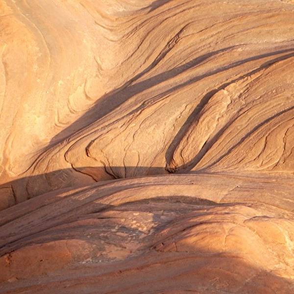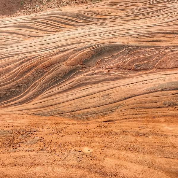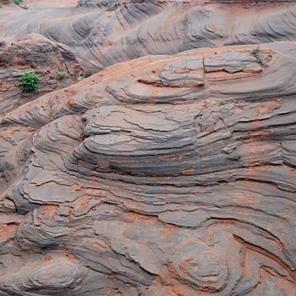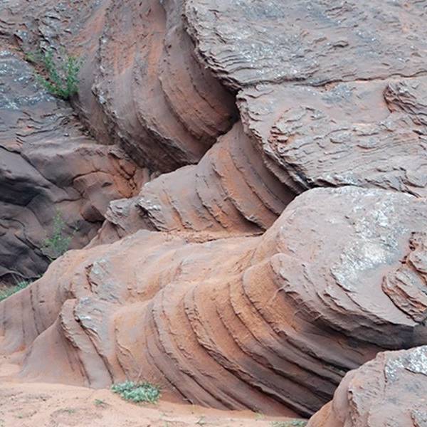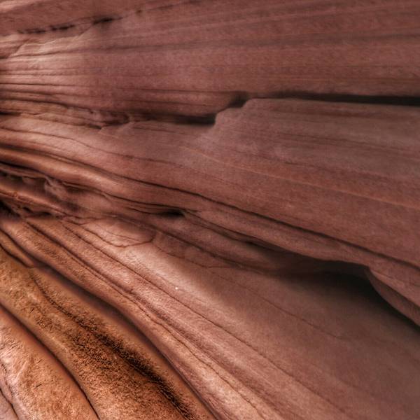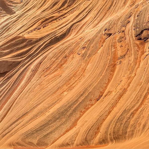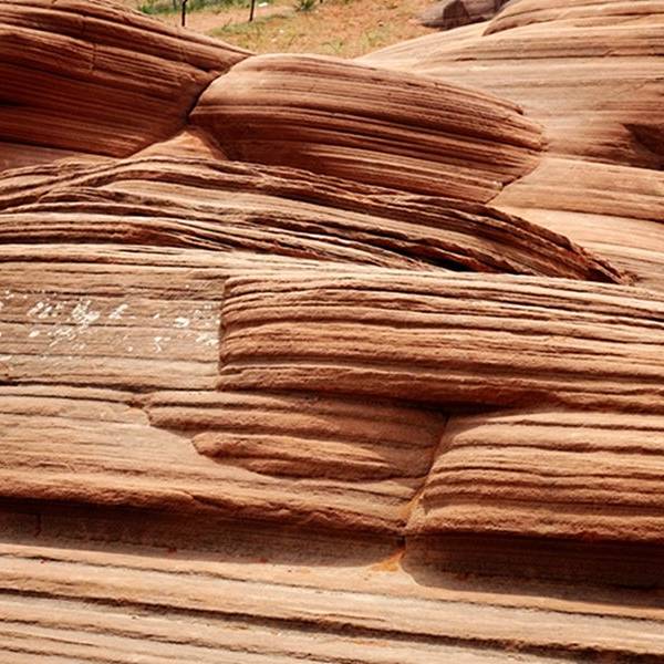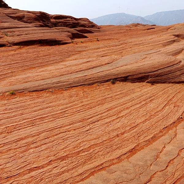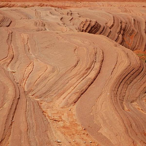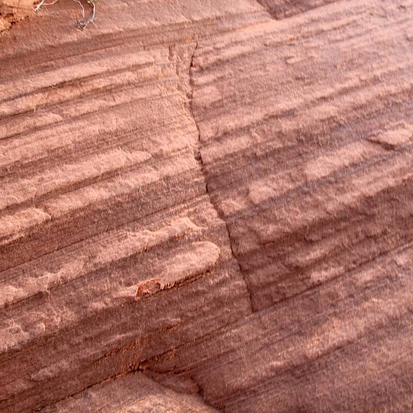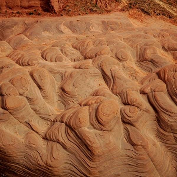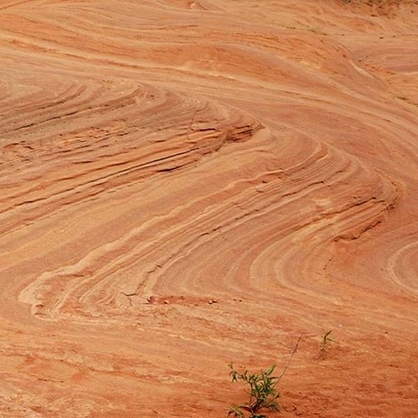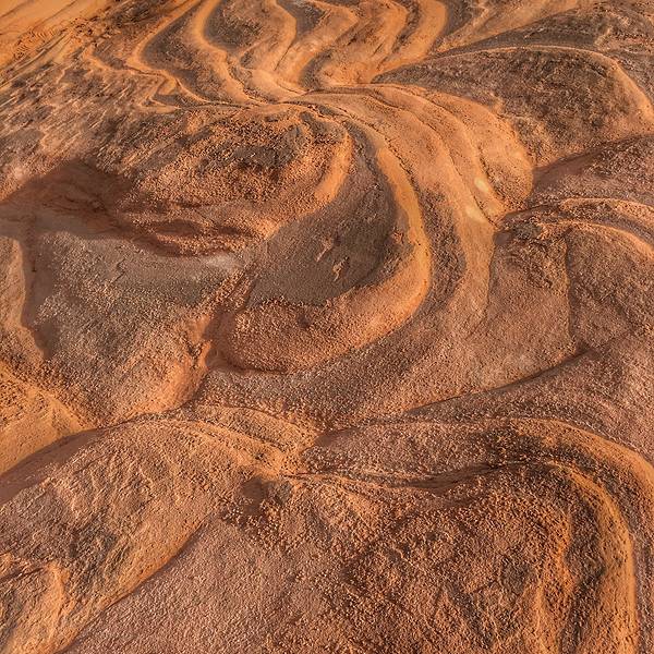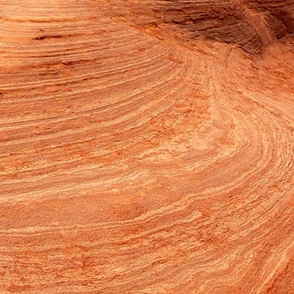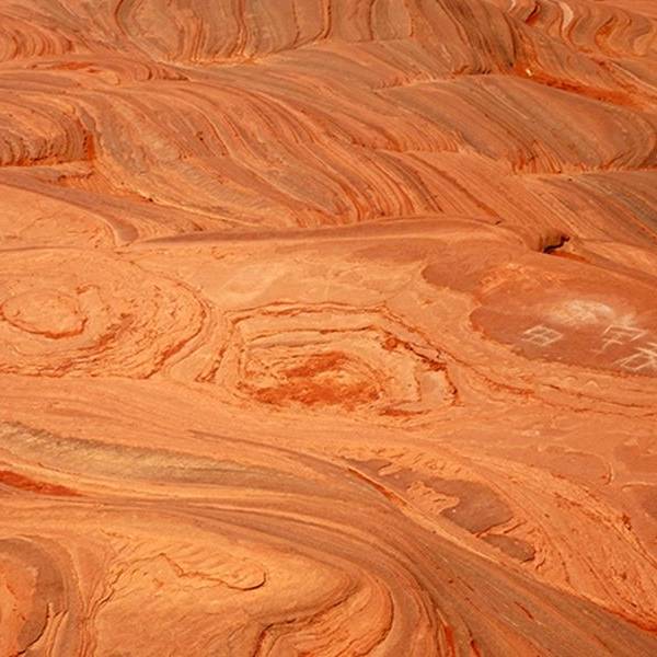 纹路的变化反映出每一层砂岩随着沉积矿物质的含量不同而产生的颜色深浅差异。红色主要是由铁和锰的氧化而产生,这些颜色不是一成不变的,往往在交错处和角落里形成更加复杂与抽象的图案。