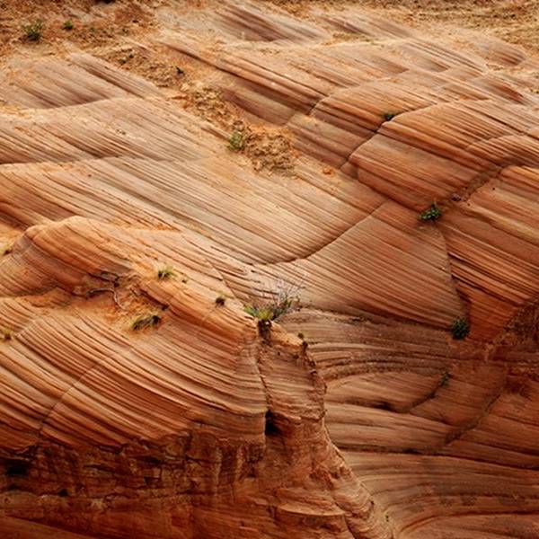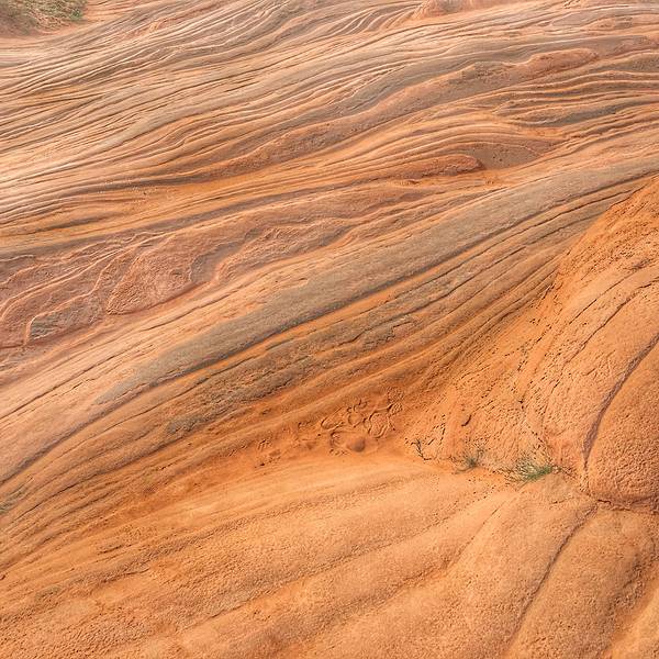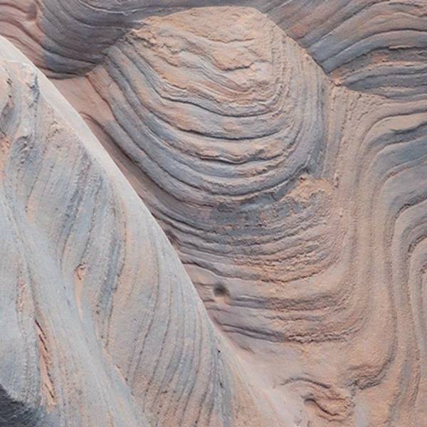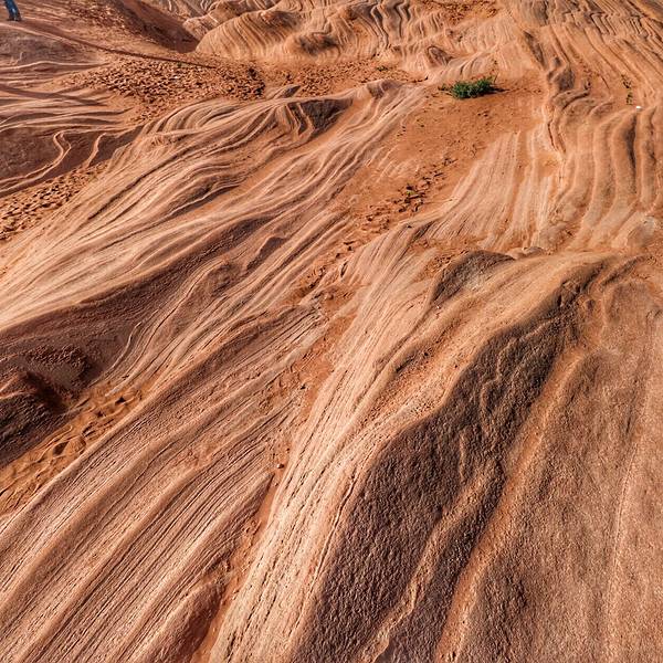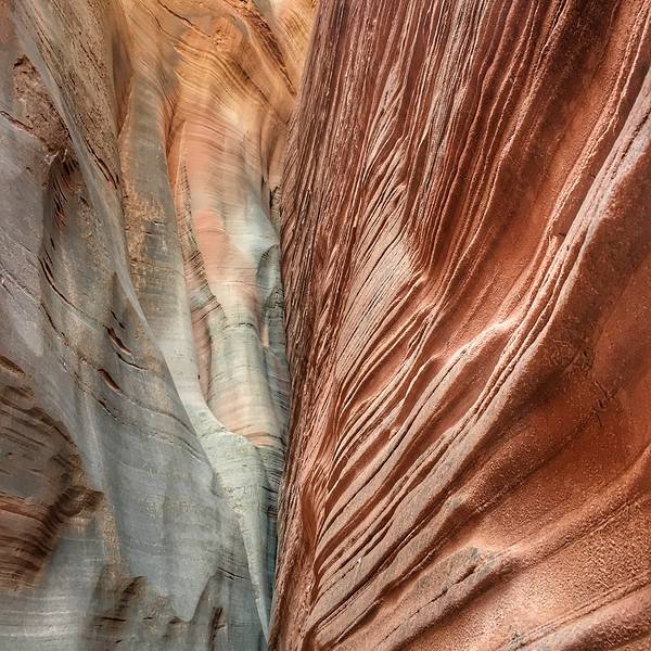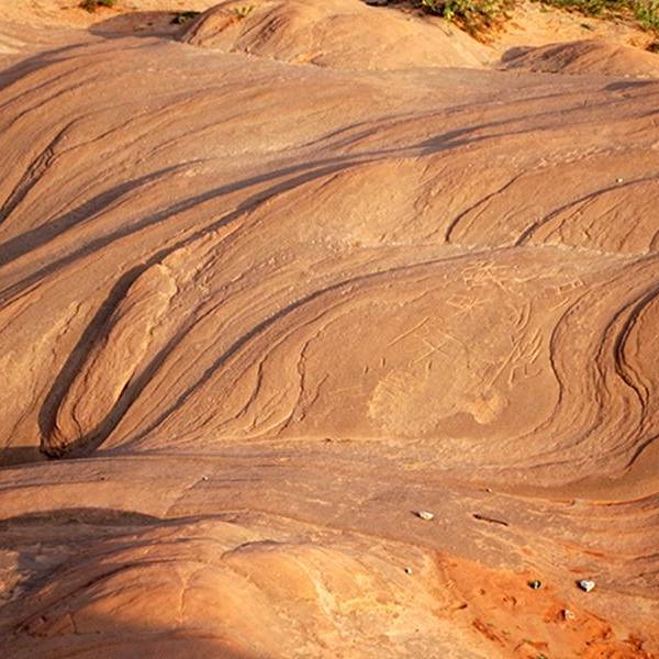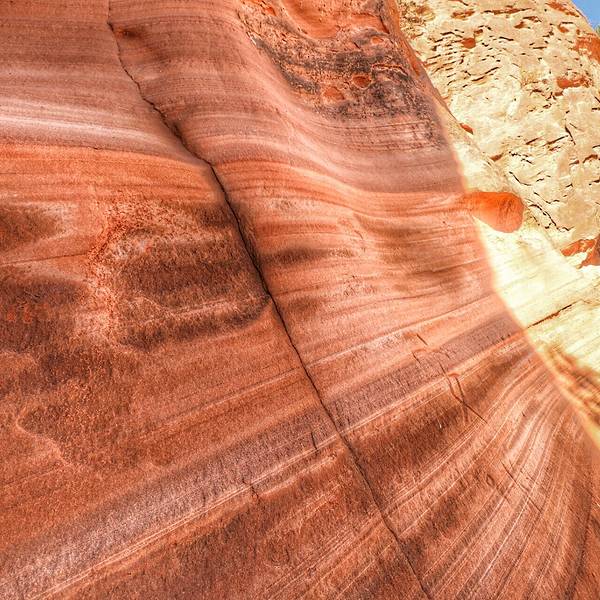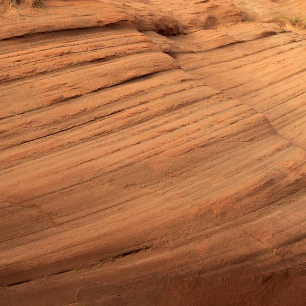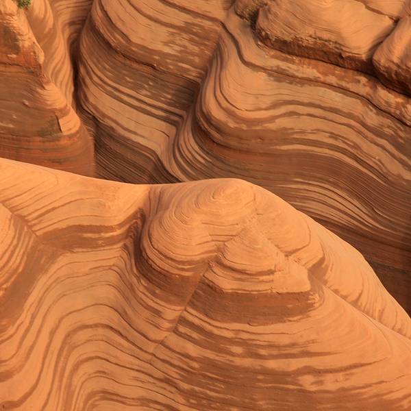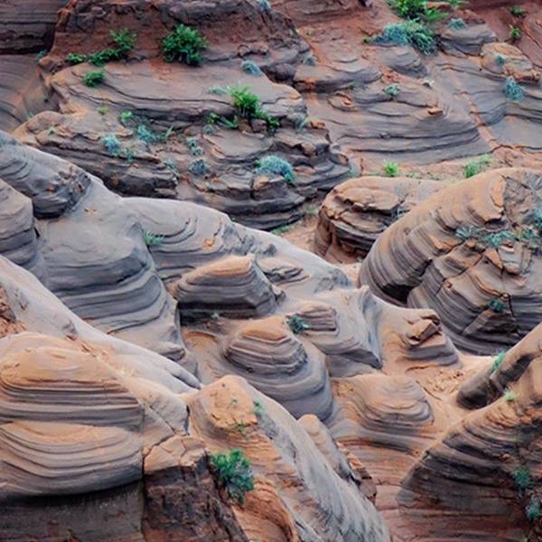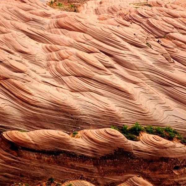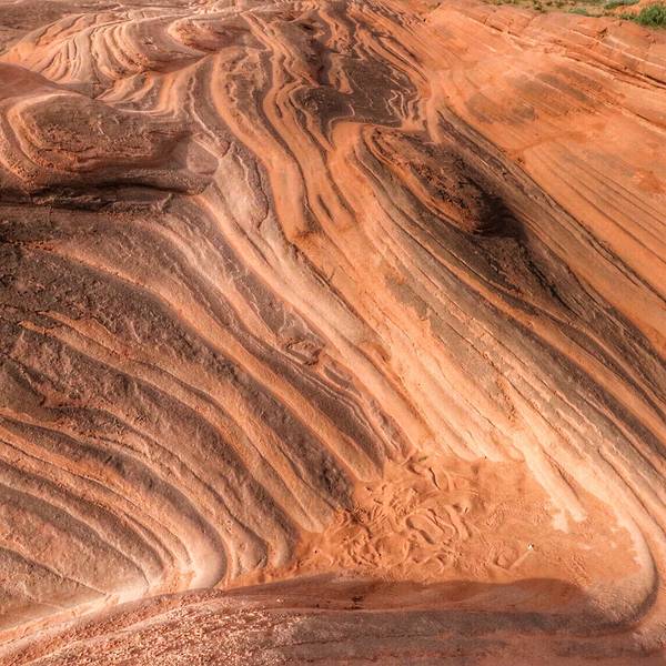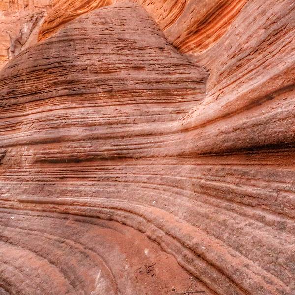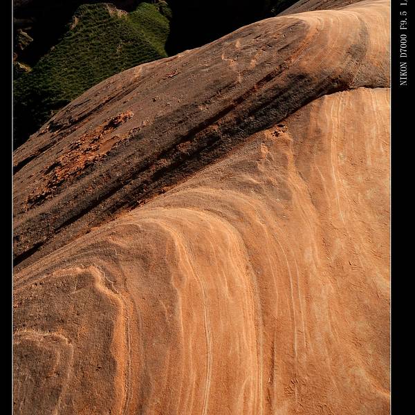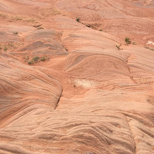 纹路的变化反映出每一层砂岩随着沉积矿物质的含量不同而产生的颜色深浅差异。红色主要是由铁和锰的氧化而产生,这些颜色不是一成不变的,往往在交错处和角落里形成更加复杂与抽象的图案。