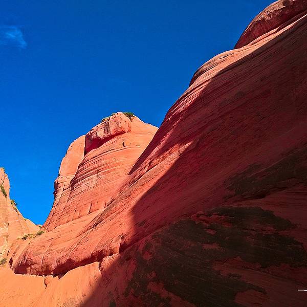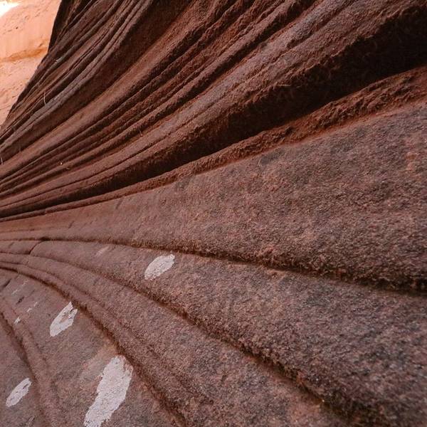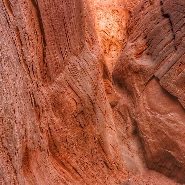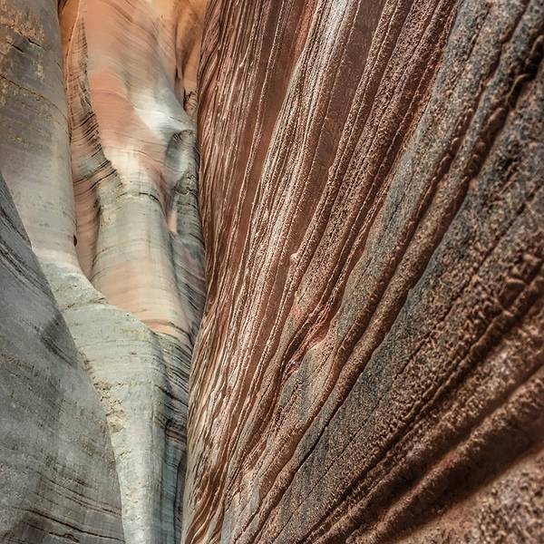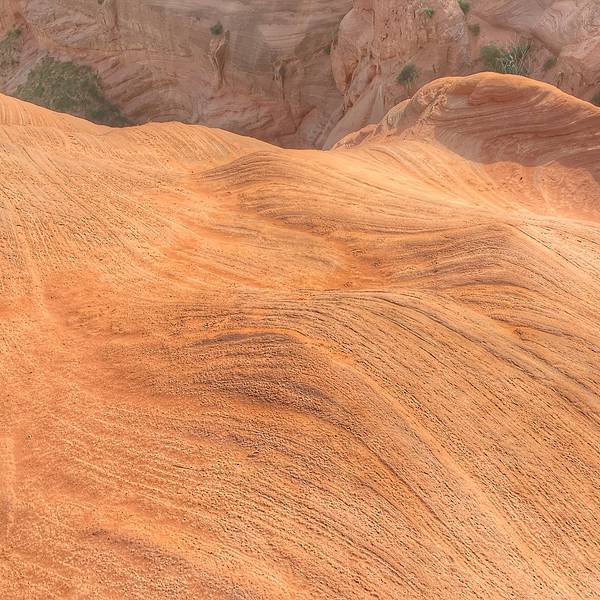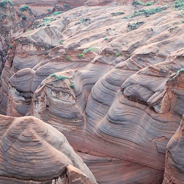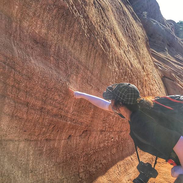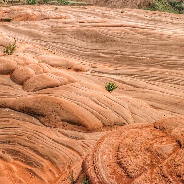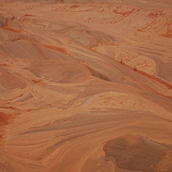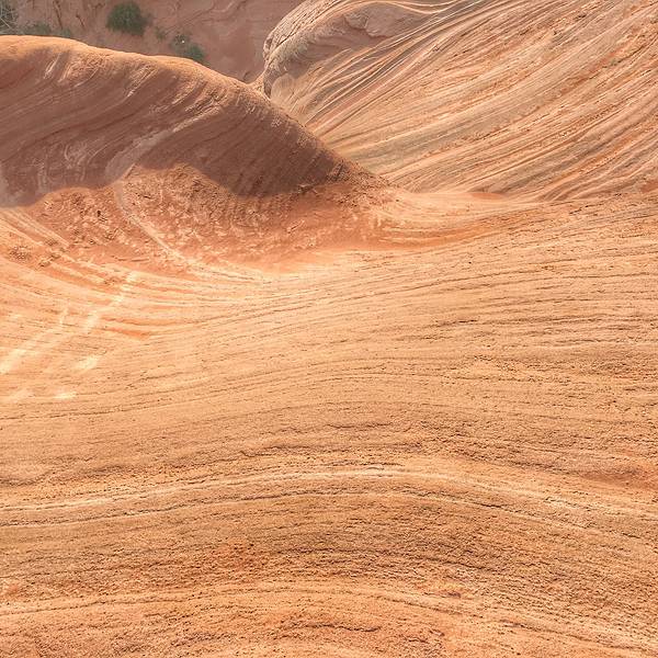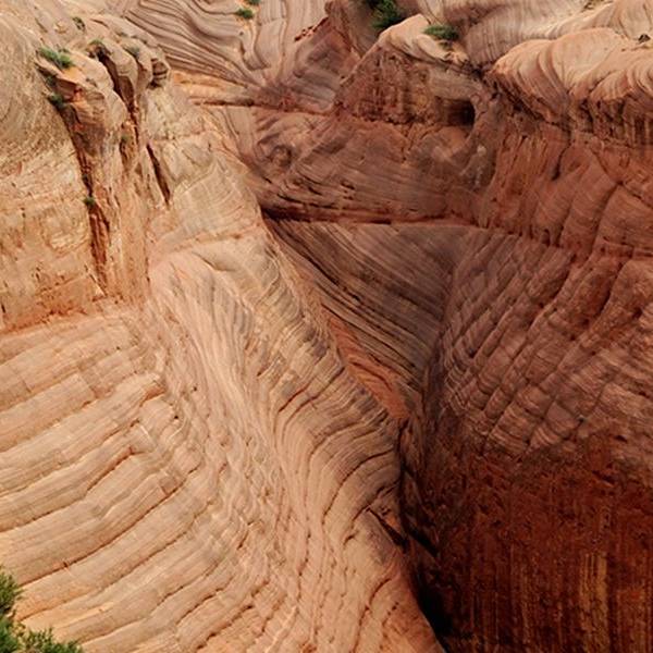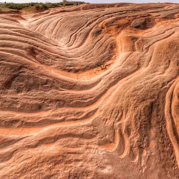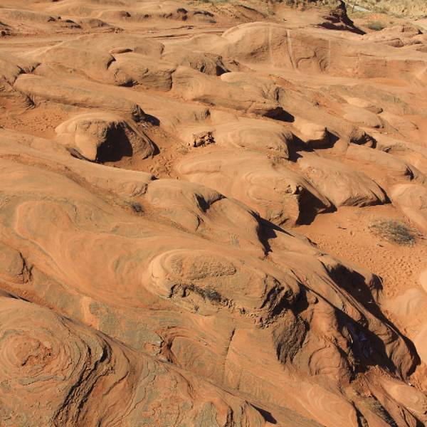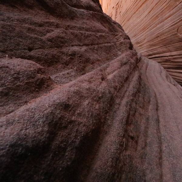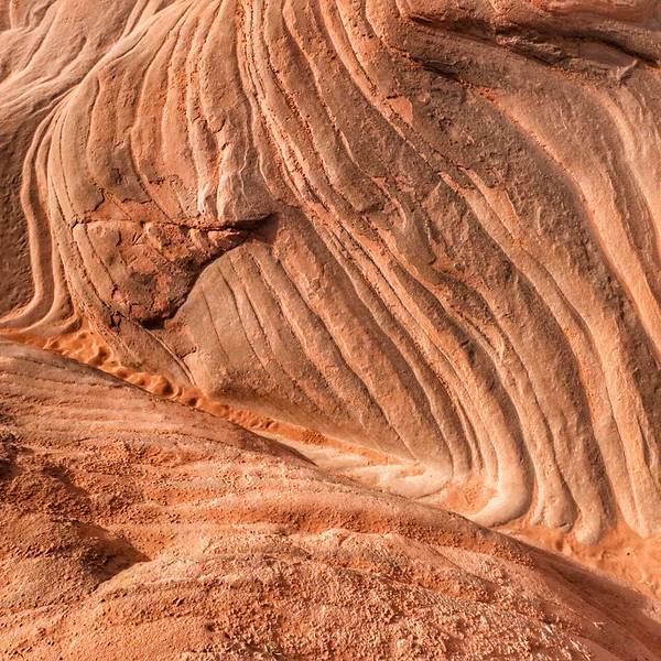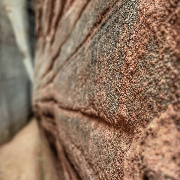 纹路的变化反映出每一层砂岩随着沉积矿物质的含量不同而产生的颜色深浅差异。红色主要是由铁和锰的氧化而产生,这些颜色不是一成不变的,往往在交错处和角落里形成更加复杂与抽象的图案。