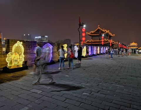 下午4点过从南门上的城墙,向西步行到下一个租车点,租的自行车,骑行到长乐门时天已经黑了,城墙上亮了灯,当时都没发现长乐门的名字,最后一张照片是在南门拍的,人形的灯分别是二十四节气。