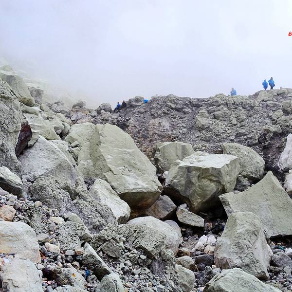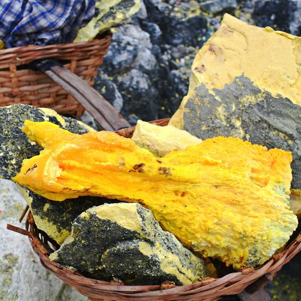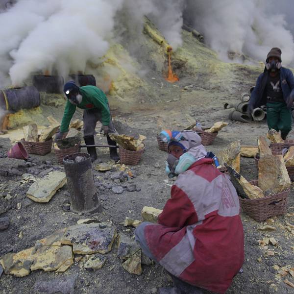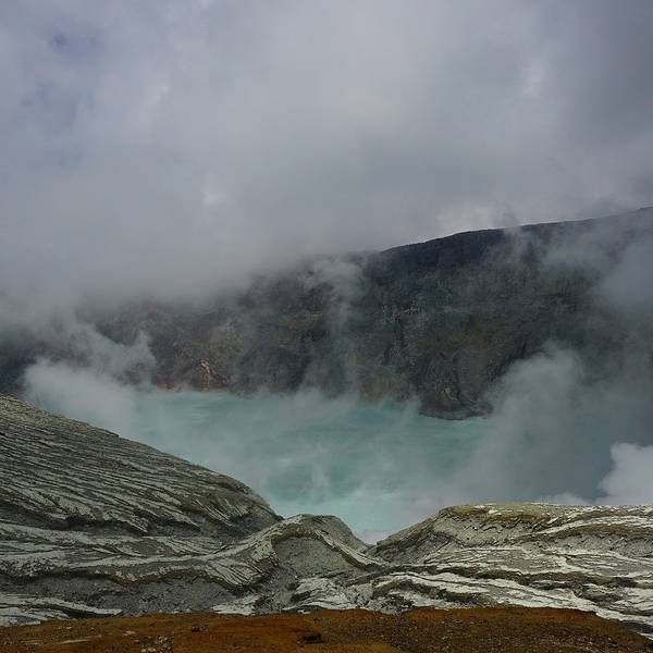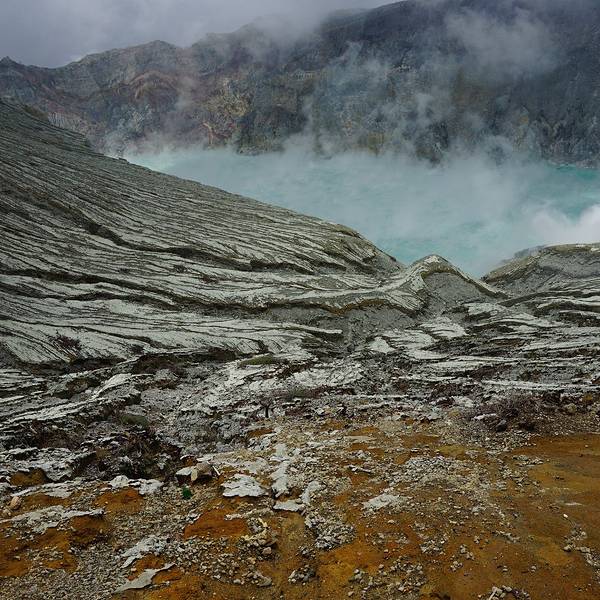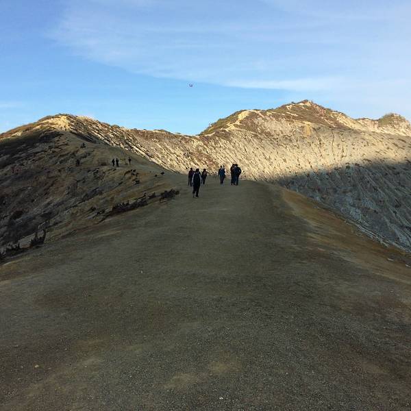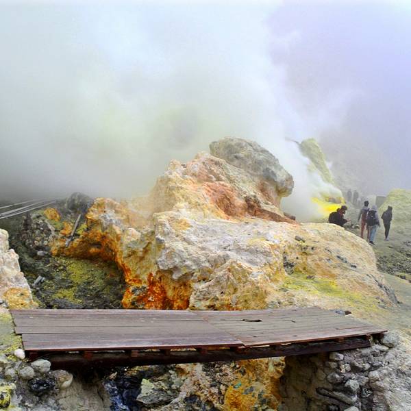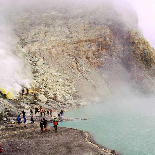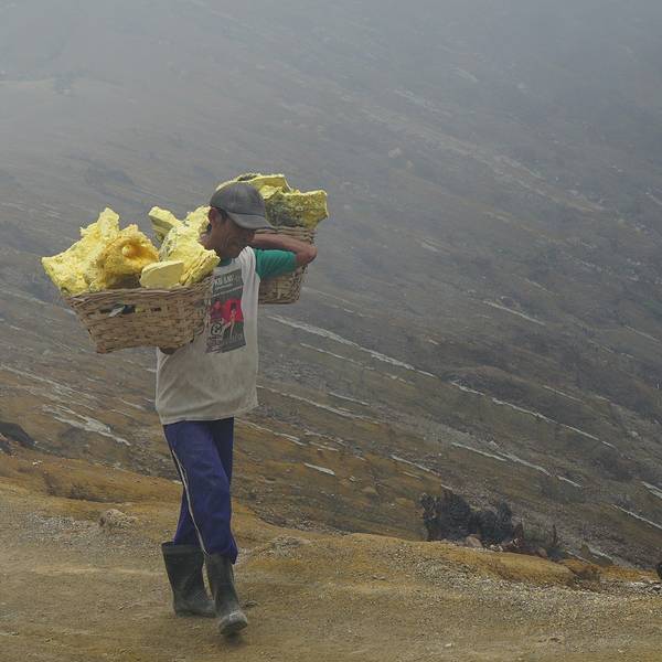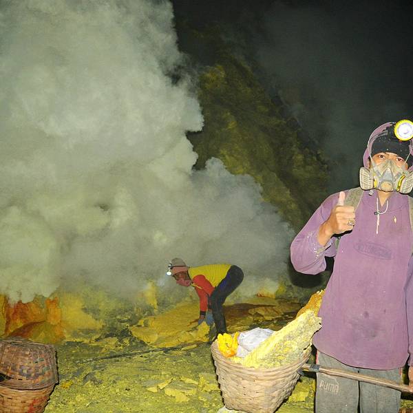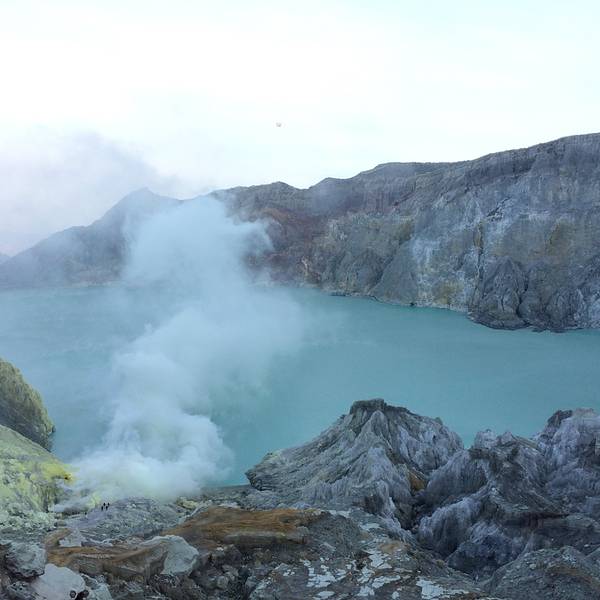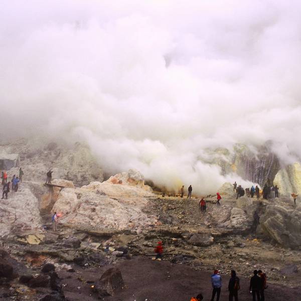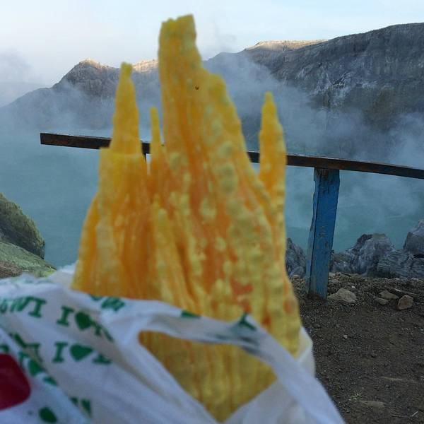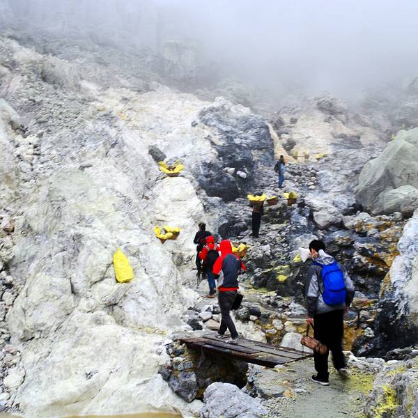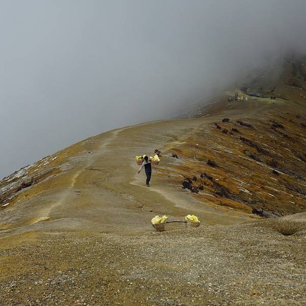 天亮以后就会看到蓝色的火山湖,湖中不停冒出硫磺气体的气泡,据说湖水的PH值非常的低,不要随意去碰。年轻的矿工长期在这里搬运硫磺原矿,一担硫矿有60kg重,而一担只能赚到30块人民币左右的钱,生活很艰苦。给他们拍照时,他们会向你索取费用,也会直接向你兜售硫磺矿石(价格根据大小在40-100k不等)。 展开