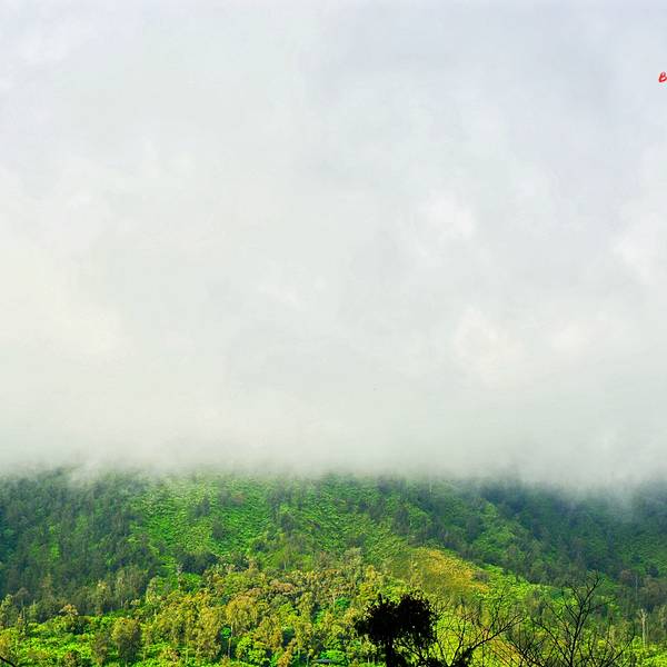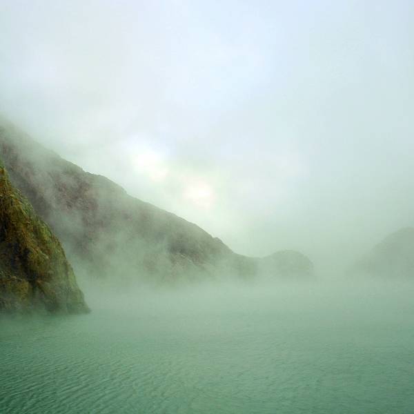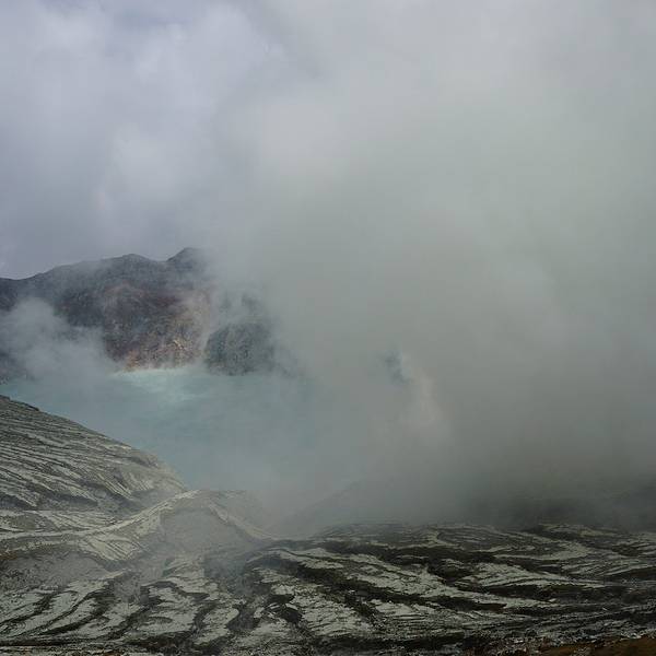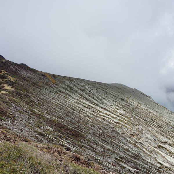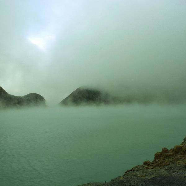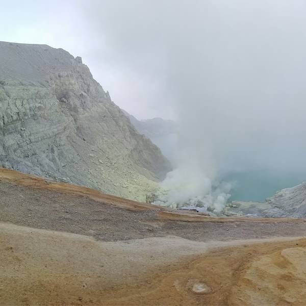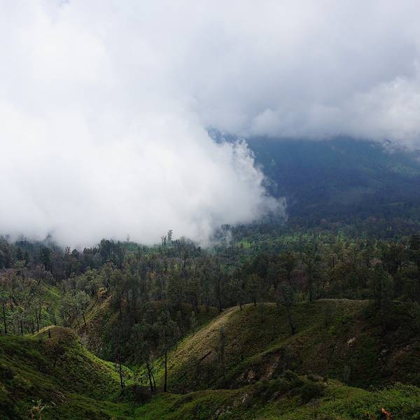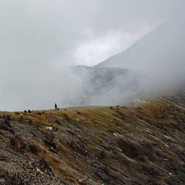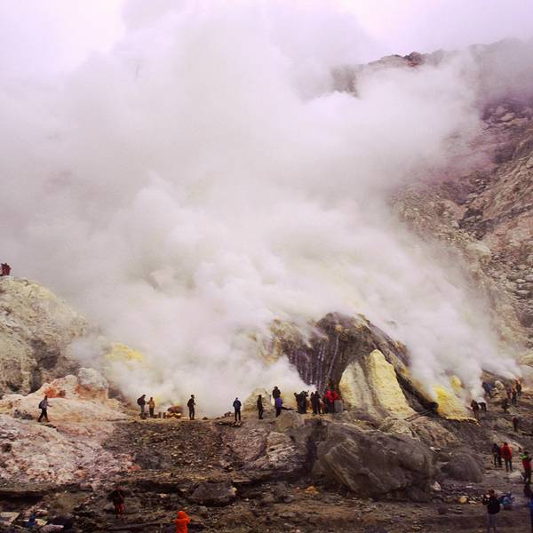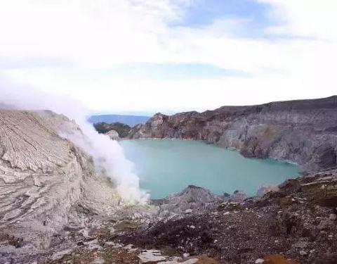硫磺的烟雾越来越大,但是看完蓝色火焰不要急着回去,在此慢慢的等待天亮,因为伊真火山旁边是一个偌大的硫磺湖,湖水呈淡蓝色,不时有风吹过,滚滚白烟从湖面散开,场面如同仙境。当火山活动加剧时,整个湖面都会沸腾起来,那一刻,你会真正体会到再大的艰险和困难都是值得的。在火山湖畔坐了一阵,继续原路下山,夜爬火山时到处是黑漆漆的一片,而下山时看到的却是伊真火山的另一面,到处烟雾升腾,到处郁郁葱葱, 展开