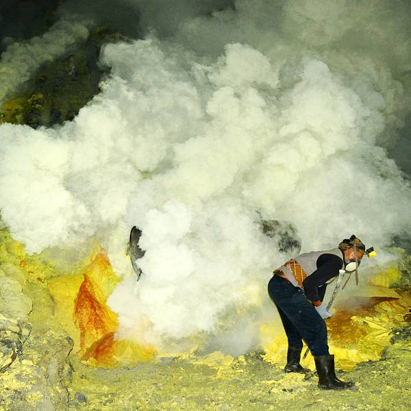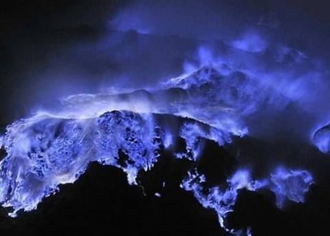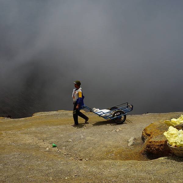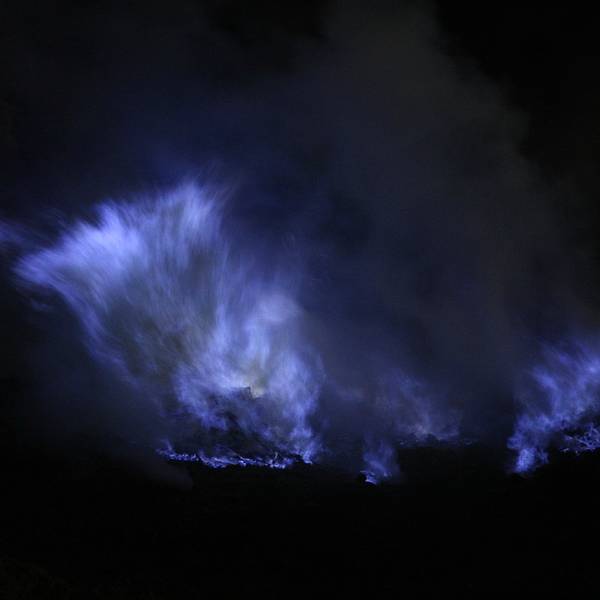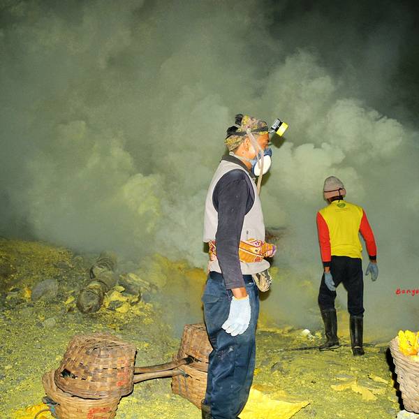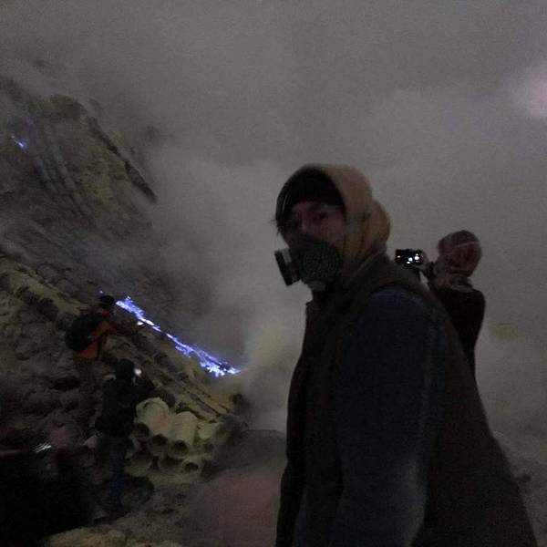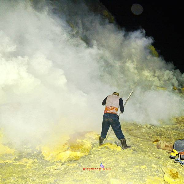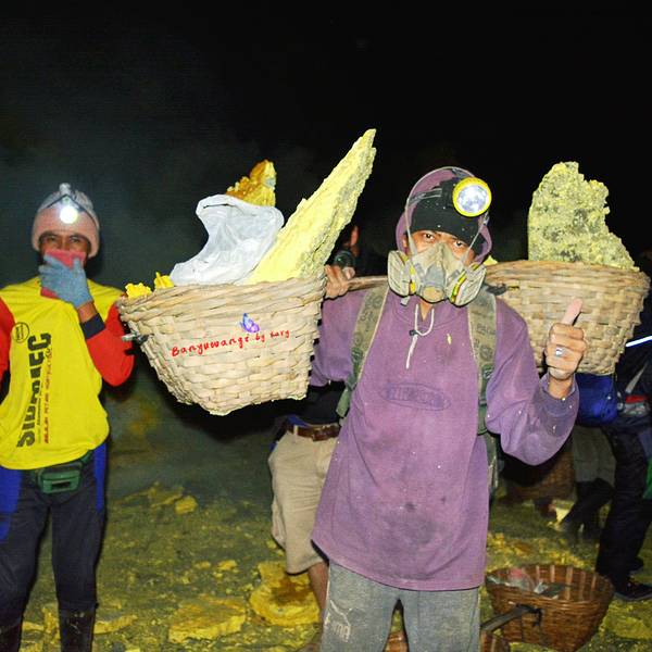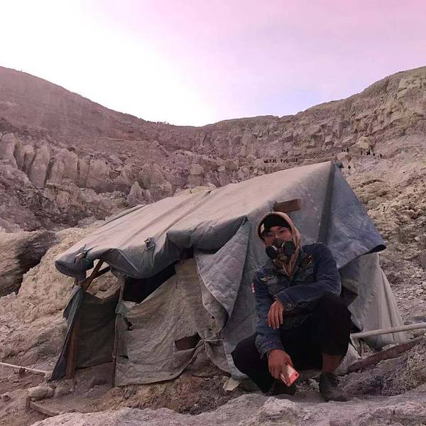 经过重重磨难,当到达火山口边缘看到一团团奇幻般的蓝色火焰时,如此奇景仿佛让我觉得置身外星世界,这般旅行体验真是头一遭体会。不过拍摄到蓝色火焰必须要靠运气,硫磺的烟雾太大太重,火山喷出的气体通过火山口内的喷气孔形成硫磺,当地的矿工则以挖掘和运输这些硫磺矿谋生,矿工们用最原始的方法采集硫磺,他们用围巾或简易口罩遮住口鼻用来抵御火山口喷出的有毒气体,这是他们唯一的防护措施。拍摄他们一般会找你收费30000RP,这是事先并不知道的,但是看到他们如此辛苦和危险的劳作让你很难拒绝。