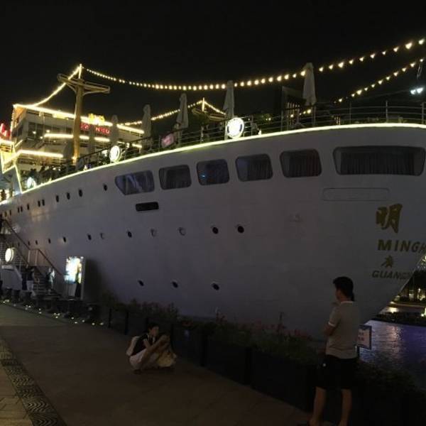 而且夜景灯光做的也不错,主要就是这艘明华号的邮轮,被改造成了甲板餐厅和船舱住宿海上世界,地铁有一站,最好晚上过来,好多吃饭的地方还有酒吧,很是热闹。