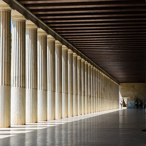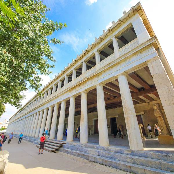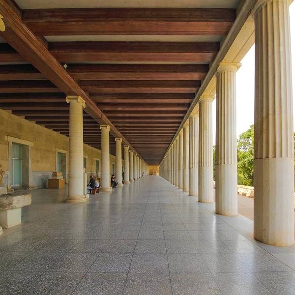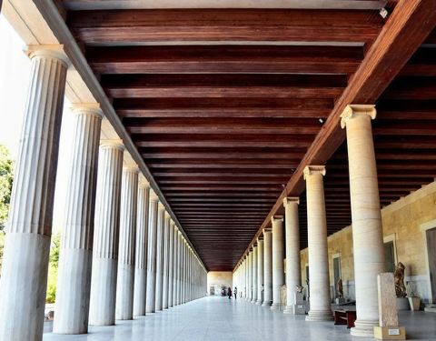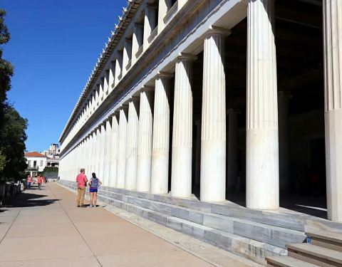 阿塔罗斯柱廊是位于雅典古市集的一个宏伟的柱廊,由帕加马国王阿塔罗斯二世兴建,作为他在此地接受教育的礼物赠送给雅典,如今的柱廊是被摧毁后重新按照原建筑一比一复原建成的。柱廊是典型的希腊化时期建筑,比起古典时期的建筑,建筑尺度更大,也更细致,建造艺术也更加成熟。柱廊的精妙之处在于外廊和内部采用不用的柱式。底层的外廊使用多立克柱式,内部是爱奥尼亚柱式,二楼的柱廊外廊和内部也是不同的两种风格,很值得好好欣赏、细细研究。柱廊曾经被日耳曼人摧毁成废墟,之后由洛克菲勒家族捐资重新修建,成为现在的雅典古市集博物馆。这座唯一被完全复原的建筑物在古迹研究上非常具有价值。
