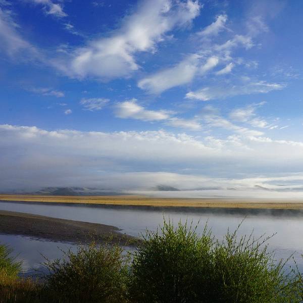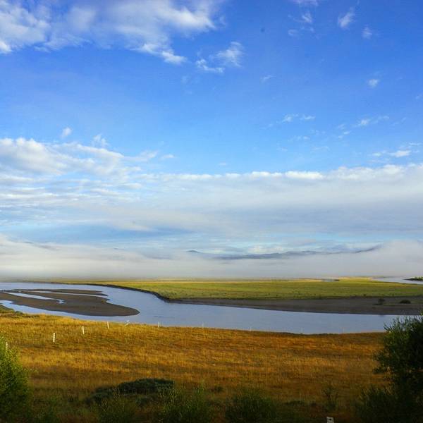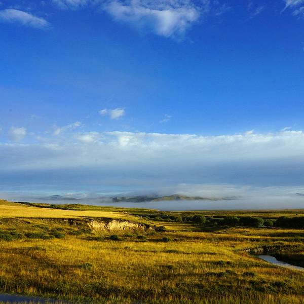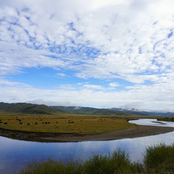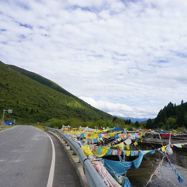 昨天下午又开始下雨,很庆幸没有继续赶路,更庆幸的是今天总算出了太阳,并因此度过全程最美的一个早晨。纯天然无干扰,完全陶醉其中。出 红原 县城,在经过一个叫月亮湾的景区后,朦胧的晨雾散去,天空彻底放晴。远方的山岭隐藏在天空中,像海市蜃楼一样映衬着这片金黄。今天是在 甘南 草原的最后一天,多日被阴雨掩盖,终于看到了她明艳的容颜。只能再次慨叹相机的无力,无法表达出全部的精彩,也必须感谢有设备的支持,可以将记忆永久留存。 阳光普照下,草原如同深闺中的美女,随便掀一下盖头,即可颠倒众生。晨雾未散,给这条 黄河 最南端的支流掺杂了一些柔美,宁静而温和。从进入内蒙至今, 黄河 流域就是一路最重要的主题,或广袤辽阔,或蜿蜒曲折,有草原湿地,有大漠荒野,更有各民族悠久的历史文明。 一直沉浸其中,甚至习惯了隔两天就能在河边拜望一下。但是不知不觉间,已经来到了它的边缘。还记得第一次踏上 黄河 沿岸,感受到的那片雄浑豪迈和勃 勃生 机。转眼20天过去,变化虽多,却仍然满怀亲切。那么就在这样一个完美的上午,说再见吧。感谢这一路无尽风景的陪伴,早已不虚此行。垭口飘扬的经幡,将开始见证崭新的征途。再见, 黄河 。一岭之隔,仿佛隔开了两个世界。漫长的 盘山 下坡后,眼前不再是起伏的丘陵和无边的草地,而是峡谷中奔涌的河水和岸边高耸的山峰。 抬眼望去,能清晰的看到远方尽头处,一座洁白的雪山插向云天。