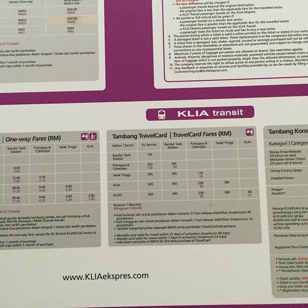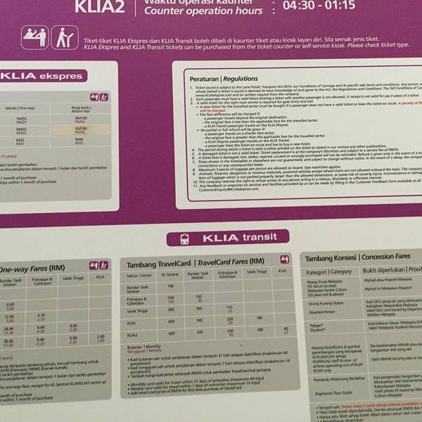 3、交通方式:从机场到市中心,都是坐到KL central,坐express和transit都是55马币单程,往返的话100马币,在level2乘坐,半小时可达,比较贵,适用于赶时间的人。比较推荐坐大巴,11马币单程,在Level 1 1号门、2号门之间的售票处买票即可,单程耗时1小时左右,具体要看堵不堵车,早上市区堵车用了1小时14分,回来没堵车54分钟到了。