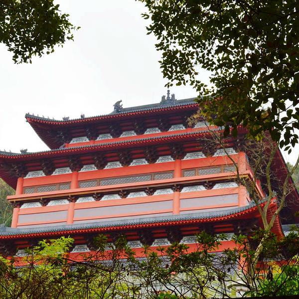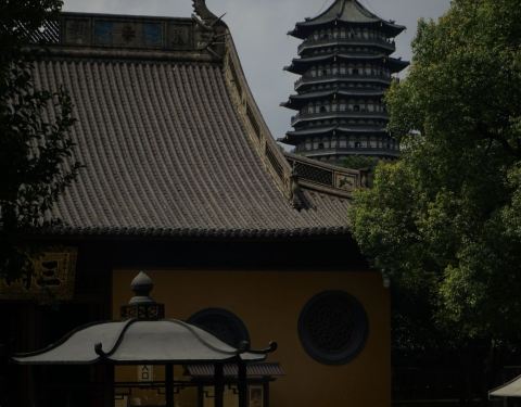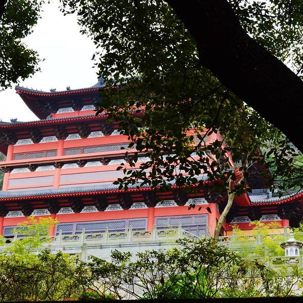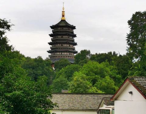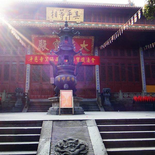 净慈寺在浙江杭州的南屏山慧日峰下,是公元954年五代吴越国钱弘俶为高僧永明禅师而建,原名永明禅院;南宋时改称净慈寺,并建造了五百罗汉堂。寺屡毁屡建。现在的寺宇、山门、钟楼、后殿、运木古井和济公殿,都是二十世纪八十年代重建的。其中大雄宝殿单层重檐,黄色琉璃瓦脊,更显庄严宏传。特别是一口重达一百多公斤的新铸铜钟,铸有赵朴初等人书写的《妙法莲华经》,计六点八万字。每日黄昏,悠扬的钟声在暮色苍茫的西湖上空荡,激起人们的无限遐思。