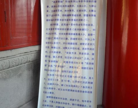 西湖十景中,仅有以佛教寺庙中的法器作为一个景观的,就是净慈禅寺里的“南屏晚钟”。这里的“南屏”是指净慈禅寺后的南屏山,“晚钟”是指净慈禅寺内的青铜大梵钟。净慈禅寺位于西湖南岸南屏山慧日峰下,始建于吴越,早前被称为“永明禅院”,是西湖历史上四大古刹之一。山门前有放生池,寺院内有宗镜堂、慧日阁、济祖殿、运木井等古迹。相传活佛济公曾修行于此,且运用神力从井内运木材建造净慈禅寺。重铸的青铜大钟高3米,重10余吨,钟上铸有6.8万余字《妙法莲华经》,每逢除夕之夜,许多市民和游客还会聚集在净慈寺钟楼内外,举行新年撞钟除旧迎新活动。当第一百零八声钟声响,正好是新年伊始之时。这一象征着祥和、欢乐、安定、团结的活动,为古老的南屏晚钟注入了新的涵义和魅力。