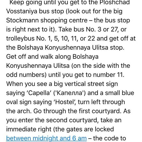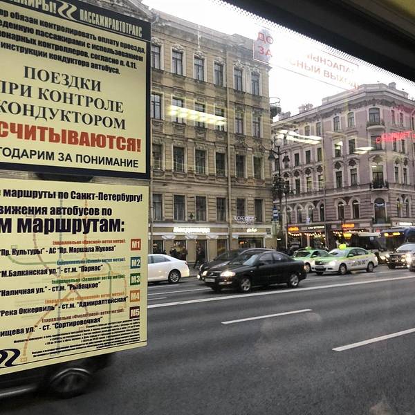如果坐地铁的话不用出火车站,就有1号线(红线)和3号线(绿线)的进站口。我坐的公交车,因为公交车下车后走的路更少一些。用2GIS查出乘车路线,导航到公交车站,非常简单。公交车28卢布,地铁31卢布一次。之前也发过邮件问旅馆怎么坐车,回复的超长又仔细又啰嗦,看得我云里雾里,其实很简单就能到达。3路坐到涅瓦大街上某一站,站名不会念,但我数了站牌上是坐4站,售票员大妈说到站她叫我,结果我路上偷看了导航,快到的时候,自己先站到门边等着。大妈特别高兴的跑过来拍着我的肩膀直夸聪明(我猜的,看表情;)