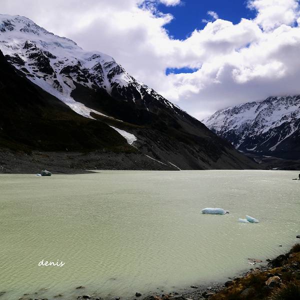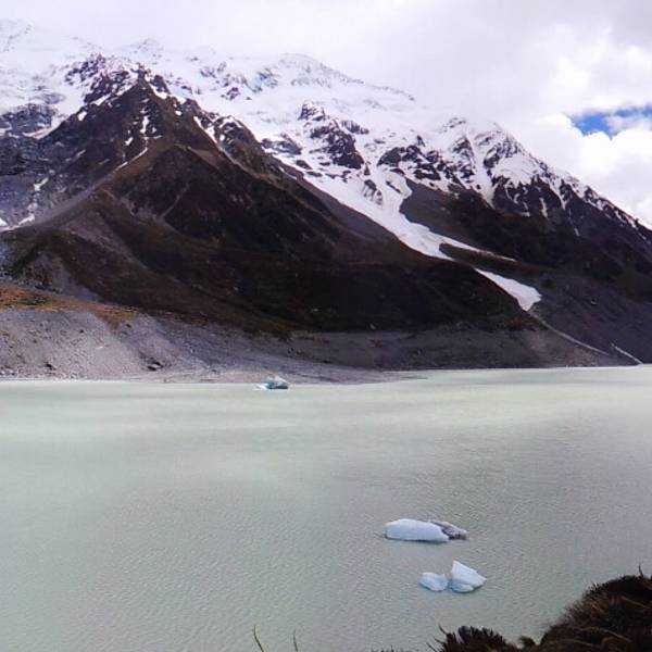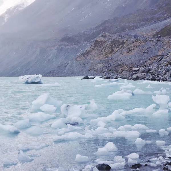木浅小道将我们引入雪峰深处,不知道还有怎样的惊艳画面出现在我们眼帘。终于到达湖边,半山腰有一处观景台,木制座椅简简单单,正好在这里解决午餐,啃着面包、嚼着饼干,欣赏周围雪山群峰美景,不一会儿,一对老夫妻拄着登山杖步履蹒跚走了过来,赶紧起身让座,交谈中得知,他们来自澳大利亚,上来冰川,走了雨林,让我深感佩服。沿着碎石台阶来到胡克湖畔,冰川横断面上,冰蓝色的断层,闪着幽蓝的光茫。乳白的湖面上漂浮着蓝色浮冰,载沉载浮,