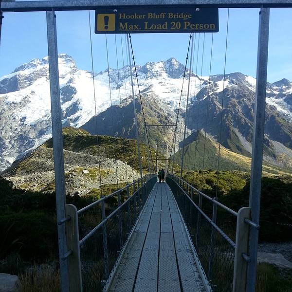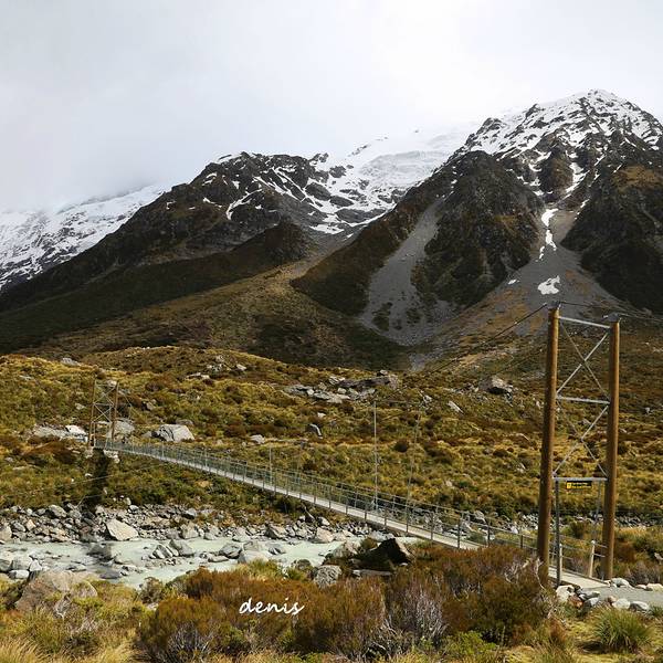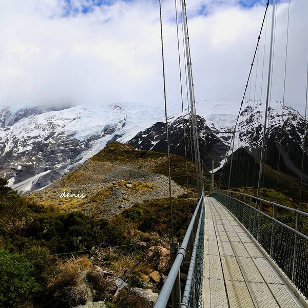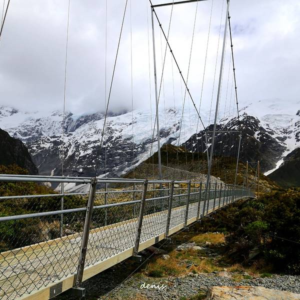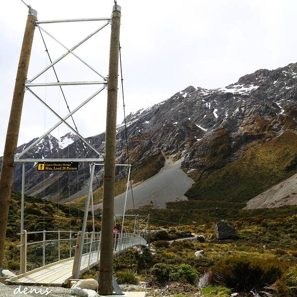 攻略上说抵达胡克冰川终点湖需经过三座吊索桥,那是最佳的观景之地,离开步道没多久,大约20分钟路程吧,就来到第一座吊桥,吊桥位于Hooker River之上,冰河源头既是13 公里长的Mueller Glacier,寒风中,木桥被吹得摇摇晃晃,似乎有点弱不禁风,看这里桥上标志,可同时容纳20人。桥下乳白色的河水似乎更像浓稠牛奶,随着冰河融解注入普卡基湖,有人比喻这段Hooker River为小溪,哪他敢下去走两步试试吗?这湍急的流水准将他冲得无影无踪。快步越过吊桥,沿着怪石嶙峋的山坡中蜿蜒前行,又一座斜拉吊桥凌空飞架,右侧桥架搭建在不断有碎石滑落的大陡坡旁,跨度足有百米之长,桥下碎石密布,看架式更有气势,本想在桥头好好欣赏一番,这时,天空下起了蒙蒙细雨,瞬间狂风怒号,根本不敢在桥上久留,一路小跑到对岸。半山晴、半山雨,这样的天气实在琢磨不透,桥另一边,雪峰下的草甸小道晴空万里,从这里至第三座吊桥大约需10分钟左右时间,到壮观的胡克冰川终点湖也就半小时。