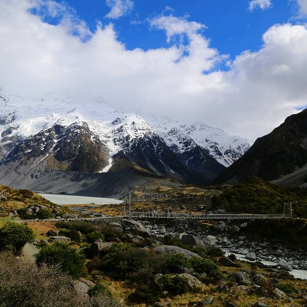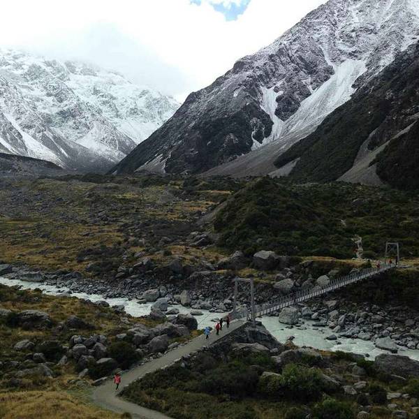 路途全程趋缓,会经过三座吊桥,风力大的时候走在桥上摇摇晃晃,更有好事者喜欢跳两下(比如我😏)。库克山主峰布满雪,像是远远召唤的坐标,指引我们一路穿过草甸、岩石、碎石路前进。