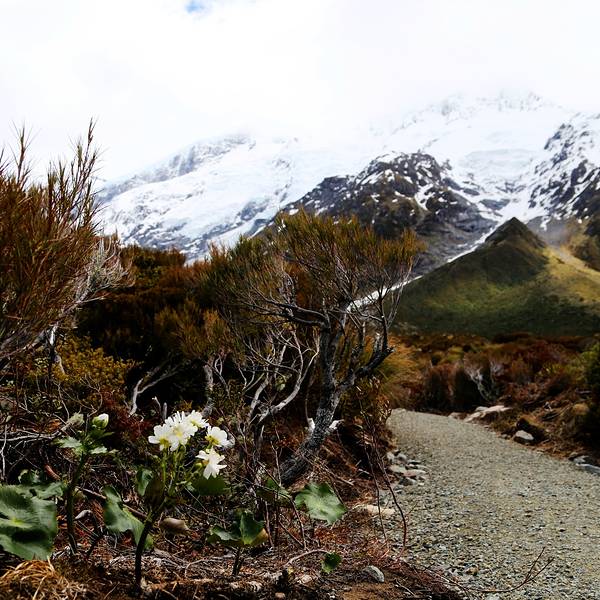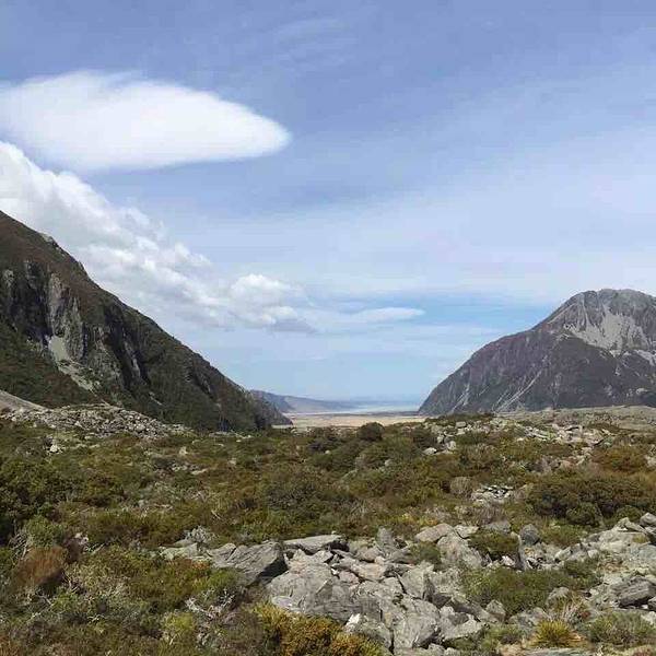 虽然天气不错,可云层太厚,雪峰若隐若现,已有部分露营房车的登山者开始出发了,俺先在露营基地的WC疏通下身体管路,轻松上路,要知道新西兰的步道很少设有卫生间的。环顾四周,满目尽是灌木丛林,山毛榉树,穿过“罗汉松拱门”,开始9公里的胡克谷步道行走,相比爬山涉水的夏洛特女皇步通,胡克谷步道可谓道路平整、路况良好,崎岖复杂的高山草甸间还铺有木道,夏季时节,漫山遍野尽是雏菊、火绒草还有酷似百合的高山毛茛,美丽极了。与另一侧的Fox冰川和Franz Josef冰川一样,库克山冰川也在迅速移动着,为了悼念首次登山事故遇难者而建的纪念碑,就在胡克谷步道的山庄旧址附近,碑文记录着1914年有3位登山者在雪崩中丧生,当时只发现了一具尸体,但12年后,因冰川融化,第二具尸体在Hochstetter Lcefall底部被发现,距离当时团队被埋的地方之下2000米,可见冰川移动速度之快。越往山上走,气温也越来越低,虽然太阳不时露个小脸,虽然前面说过胡克谷步道道路平整,可全程都是碎石子路,还是比较滑,山腰还可见发生过碎石滑坡,冲毁草甸植被的痕迹依稀可见,