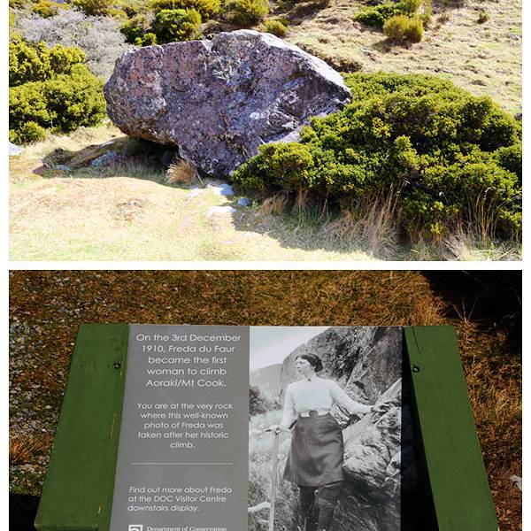 回程途中,发现一块巨石还有一张照片说明,她是世界第一位成功登顶库克山的女性, 登顶后,Freda在这块巨石前留下了自己身着短裙手持登山杖的飒爽英姿。 展开