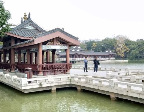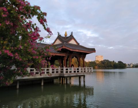 在北方已经入冬的寒冷季节,这里白天温度还有20多度,感觉到有些热,惠州是个不错的过冬之地。早上来到丰渚园内,这个公园位于西湖的一角上,临湖而建,以水景为主,建有许多的亭台楼阁,感觉十分悠闲,在公园里有不少当地人正在晨练,因为很少有外地游客来到这里,这个公园是当地人正常生活的一部分。