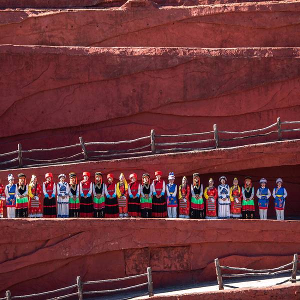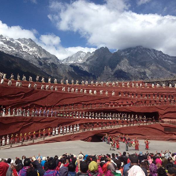 《印象丽江》是张艺谋导演亲自指导的大型演出,演出的舞台是一个宽大的露天剧场。舞台是一个全红的布景,意在形成一个高岗石岩的场面。舞台后面以玉龙雪山作为大背景,气势雄浑。