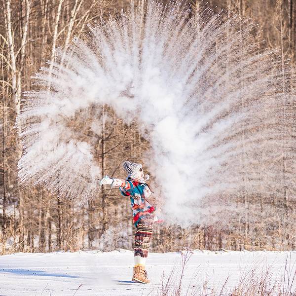 3·开水往斜上方开始撒,最好用手臂挥一个圆圈。嗯,我说的挺好的,自己撒的时候感觉像撒出了一个瀑布,泼水成冰是一个技术活。我前前后后撒了五六次吧,就是一个瀑布,让我安静的在瀑布里待会。