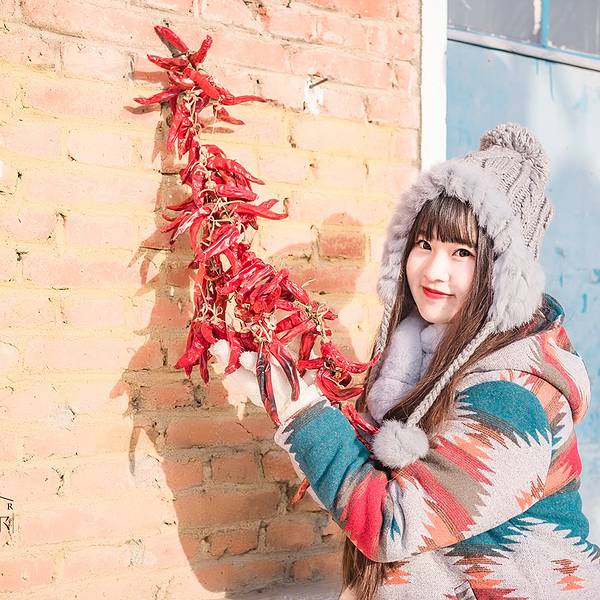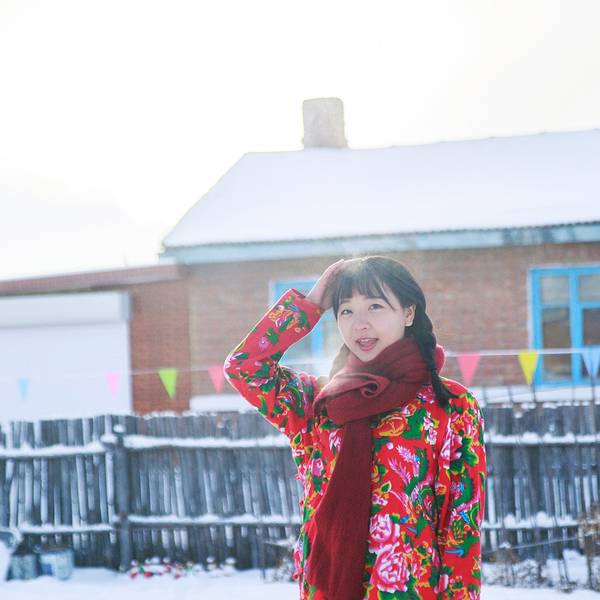 在雪地配这身衣服,确实喜庆,短时间内居然忘记了寒冷。