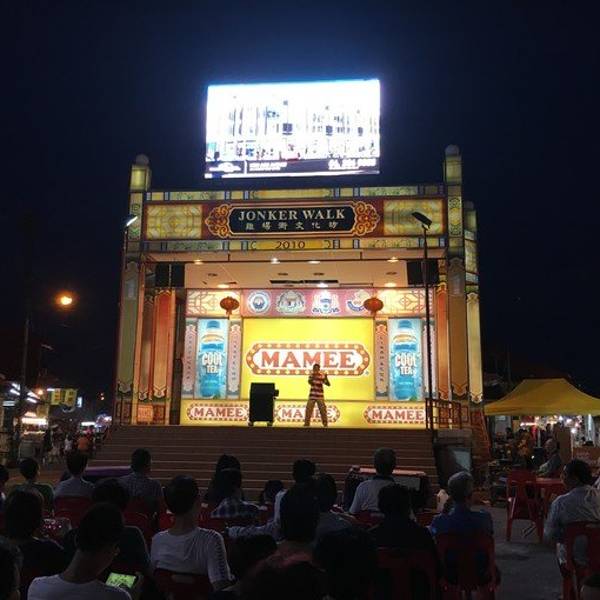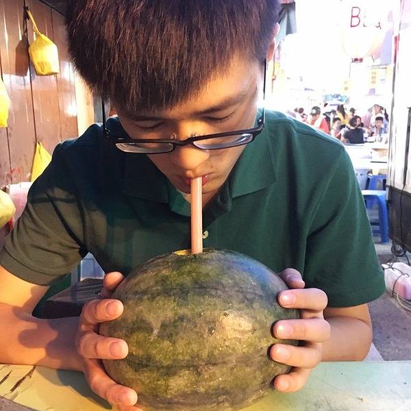 然后坐17路公交车在【荷兰红屋red house/Stadthuysf】下车,步行到达酒店。休息后,晚上去【鸡场街jonker street】的夜市吃饭。夜市上有一种卖西瓜汁的,是在西瓜上打一个小口,然后直接在里面把果肉打碎,喝的时候是抱着小西瓜喝。