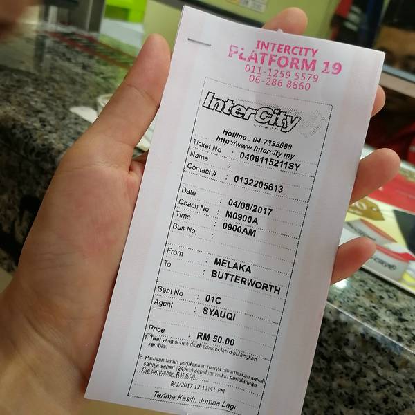 从马六甲坐车去槟城:约7h 9:00am~16:00pm ①我们是从KL坐车到马六甲汽车总站的时候就顺便买好了第二天出发去槟城的车票,车站里有很多售票窗,并不是每一个窗口都能买到去槟城的车票,每个窗口上面都会写什么汽车公司,我们买的是Inter City的票,RM50一个人,从马六甲汽车总站到北海Butterworth的,下车后在公交总站里有免费的公交车free bus送我们到北海码头Butterworth Jetty,然后买船票,RM1.2一个人,20min左右到达槟城码头。 ②每个汽车公司的发车时间是不一样的,价格也有一点出入,一家公司一般每天只有两班车去槟城的。可以自己选择。