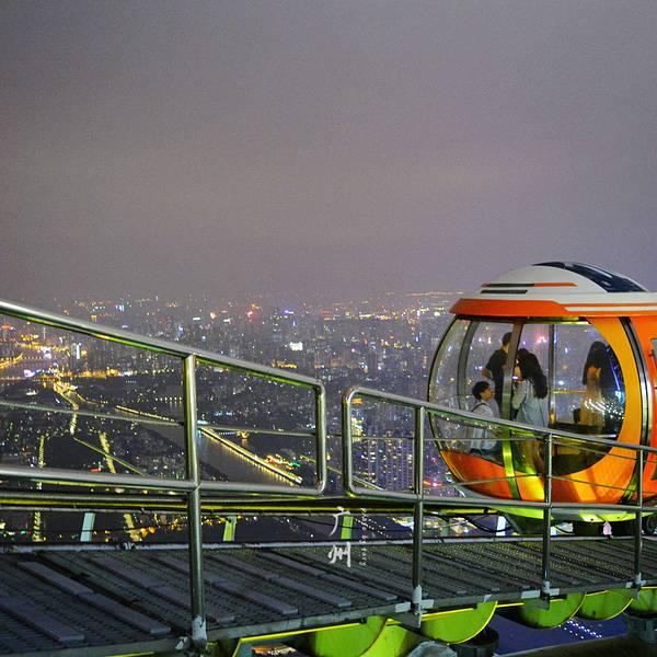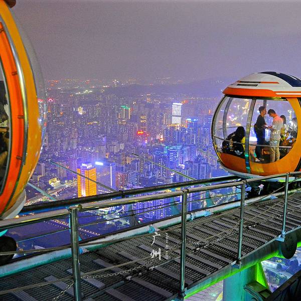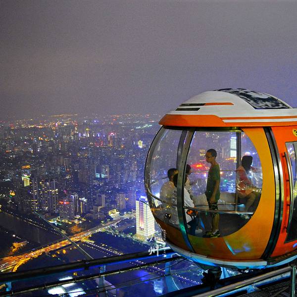 广州塔摩天轮特别的美丽,不是垂直的,更接近水平,有一点弧度。在广州塔平台的外围,悬空的广州塔摩天轮特别的美丽,不是垂直的,更接近水平,有一点弧度。在广州塔平台的外围,悬空的。遗憾的是摩天轮底部不是透明的,四周是透明的可以看到广州的夜景。