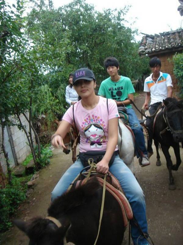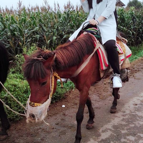 早上起来,在小镇中看到了这些水果,真的好惊喜,每一样都买了一些当做早餐了。早上起来的我穿的很民族,但是臭美一会就要换上便装,因为今天我们要走过一段古人走过的路程---茶马古道。在横断山脉的高山峡谷,在滇、川、藏大三角地带的丛林草莽之中,绵延盘旋着一条神秘的古道,这就是世界上地势最高的文明文化传播古道之一的茶马古道。我们的“茶马古道”之旅是从位于丽江城西8公里处的拉市坝开始的。山脚下马场,纳西族的赶马人牵来云南那种特有的滇马,每个赶马人带3到4匹。说实话,这些马长的都不怎么好看,没有蒙古马的那种剽悍,也没有英国纯血马的那种高贵。个头不大,身上的鬃毛也有些脏。我在担心我这90公斤的身体会不会把她压趴下!可以说,从小到大,除了骑过牛以外,我连驴子都木有骑过,更别说骑马了。就这样晃悠悠的骑在马上往前行咯。有趣的是,听赶马人说我的坐骑叫“师父”,我就给赶马人骑的那匹马取名“八戒”,另外一个同行女孩子骑的一匹调皮的马喊做“悟空”,她老公的那匹就叫“沙僧”,我的同伴骑的刚好是一匹白马——那就叫她“白龙马”,是不是很有意思呢,哈哈!旅途中总会有这样那样的感觉,遇到各种各样的人,喜欢就好。遇到的一个大姐姐。