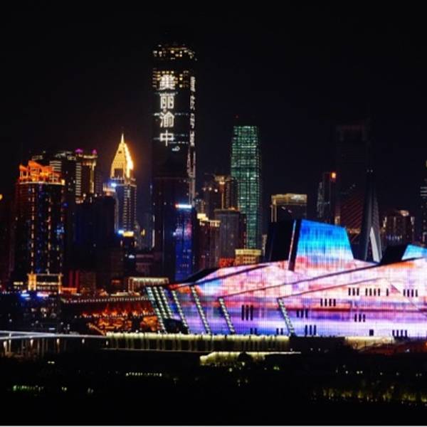 它,除了欣赏来自全国各地的剧场演出以外,夜晚在这儿还可以凹出各种各样姿势不一的美丽剪影,随着有机玻璃不同颜色...它,重庆经典十大地标建筑之一。