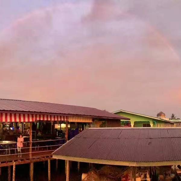 这种美丽的小生命真的太可爱太珍贵了,可惜我们这里基本都已经看不到了。落日是真的美,这只是刚开始返程下了好大的雨,晚上还有看晚霞和萤火虫的行程,心里暗暗着急。事实证明,亚庇的雨就是阵雨,四五点还噼里啪啦的雨,等到了该看晚霞的点,晚霞自然就出来了,安啦,不用着急。红树林大概就是这样的,我借用下...返程下了好大的雨,晚上还有看晚霞和萤火虫的行程,心里暗暗着急。事实证明,亚庇的雨就是阵雨,四五点还噼里啪啦的雨,等到了该看晚霞的点,晚霞自然就出来了,安啦,不用着急。红树林大概就是这样的,我借用下别人的图,谢谢啦!下午长鼻猴之旅,长鼻猴确实是看到了,而且看到了好多只,但是太远太远,唯一的感觉就是这种猴子比猕猴大,其他没有了。之后还会带你去看长尾猴,就是这种,也就是动物园里那种,其实没啥意思。因为下了雨,我们运气特别好的碰上了彩虹,真正的半圆彩虹,漂亮!红树林的餐厅大概就是这样的,东西么,真的,饿了能吃饱就行.落日是真的美,这只是刚开始。可惜还没等到火红一片的时候就被导游叫回去吃饭,真正最美的一刻没有看到,不开心!等着彩霞出来在时间,我们继续做创意秀。