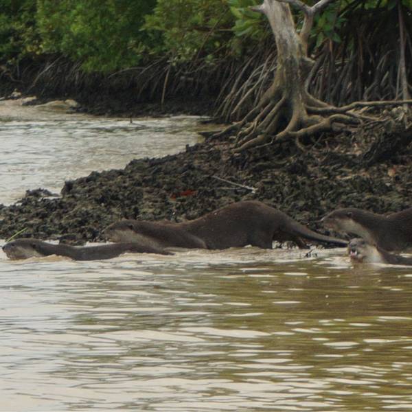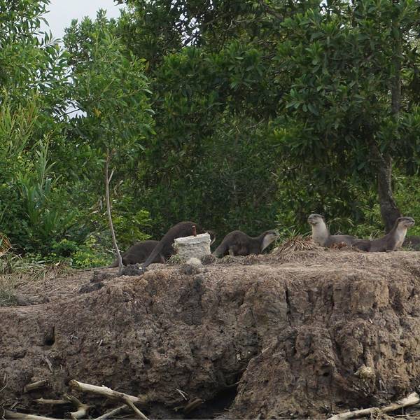 接下来的就是游船围绕红树林游览看长尾猴,导游告诉我们红面的猴子现在季节不对,很难看到,长尾猴比较多。在行驶过程中,发现了一窝的海狸在岸边,估计有七八只,大大小小的海狸,一直在向着对岸呼喊,原来在对岸还有两只,这两只比较大,不知道是不是父母呢~好原生态,在这里真的随时会有新发现。看完红树林已经快到日落时间了,幸亏天公作美,没有乌云,我们马上赶往隔壁的沙滩。