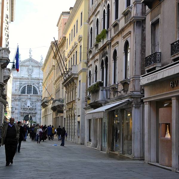 几乎所有世界级的一线名牌旗舰店都聚集在马索购物大街。不若威尼斯寻常街道那般窄小,紧邻圣马可广场的马索购物大街宽阔气派,周末常可看到衣着高雅、姿态雍容的人们在此逛街购物,而观察这些爱漂亮而且打扮得体的意大利人也是一种享受。