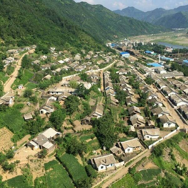 中朝边界、能看见朝鲜的小房子、和一些劳作的农民