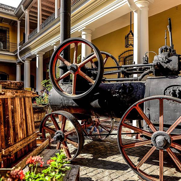 一出门,旁边就是智利国家美术馆,近水楼台嘛,我这个博物馆迷肯定是不想错过了博物馆门前的巨脚马雕塑,要是真有这样的马,心想骑在上面,会是什么感觉啊,肯定很好玩。美术馆大厅很喜欢这副画,初看有种凌乱的美感,浓郁的色彩在第一时间就吸引了我的眼球,细看画里有着女性私密处的花朵,正绽放着,带来了生命。虽然最后还是没能完全看懂作者想表达的意境,但就是喜欢这种隐晦的画感,哈哈。橱窗里的一架古董蒸汽车歌剧院干净的街道一座庭院内摆放的老式蒸汽火车头正巧,庭院里有乐队在演唱