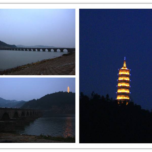 其实从国道206快到江边的时候就能看到江上横亘着一座石桥,这就是明代石桥万年桥,400多米长,桥面宽至少6米,23个桥洞。桥上有隔离桩,机动车不能开过去,走路骑车可以过去,桥的对岸的山上就是聚星塔,始建于明万历,重修于乾隆,已经很晚了,远远地拍了张夜景就出发了,实在没时间爬了。