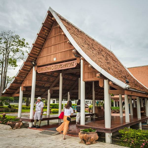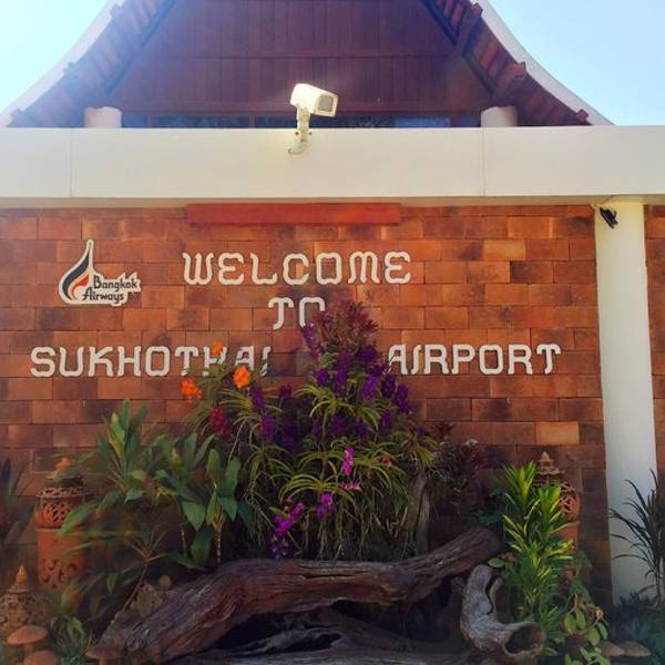 素可泰唯一的一个机场,它是曼谷航空公司旗下的第二个度假经营机场。素可泰机场有雕塑、花草、喷水池,像是一个大公园。行李没有输送带,就一个平台,行李放上面,旅客各自认领自己的行李。自然也不会有到达大厅,两步路就出了机场,外面更像个大花园。