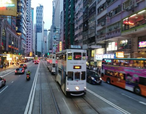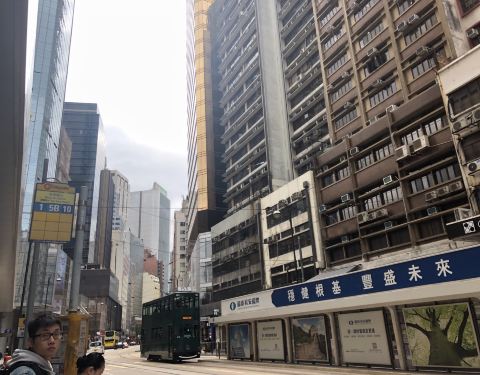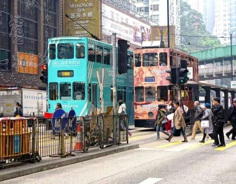 维多利亚港的另一端,你可以从上环走到中环,再走到下环。而这上环的街道相对比前两者宽那么一点,但是在寸土寸金的香港,真的也不算宽,各种各样的钉钉车和公交车以及汽车行走在上面,显示着它的繁华。
