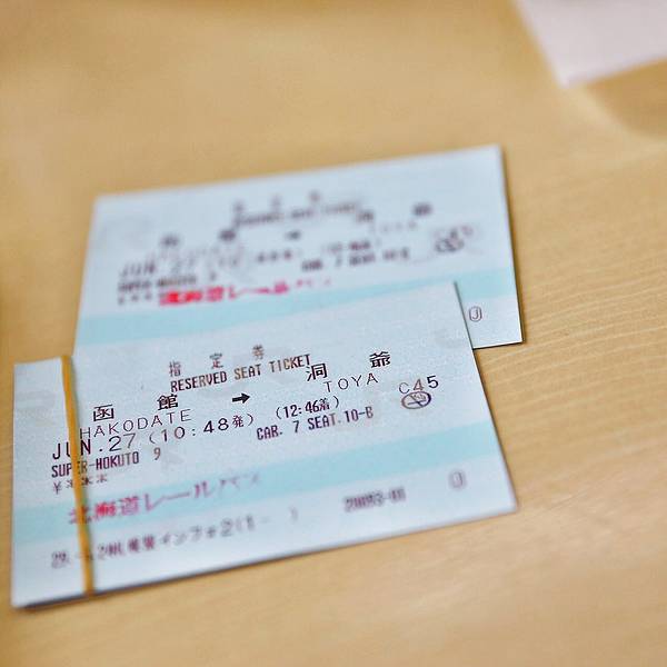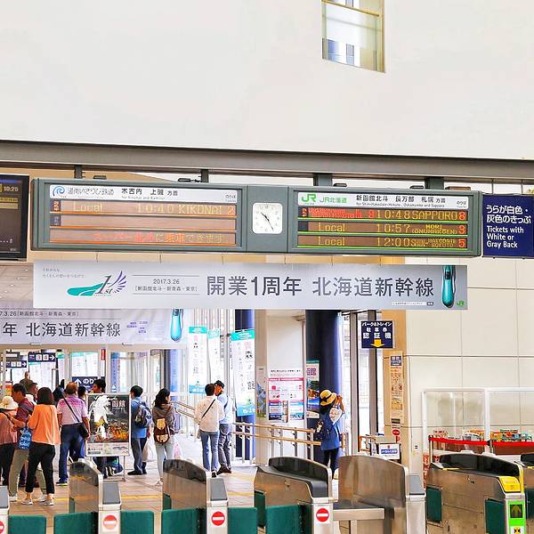 返回酒店拿上行李前往JR站,准备前往下一个目的地洞爷湖。在函馆站的进站口旁有一个特产商店,贩卖各种零食甜品和火车便当,可以买一些在火车上吃呢。本来想试试函馆特色的乌鱼包饭,可惜时间太早还没做好,吃货...返回酒店拿上行李前往JR站,准备前往下一个目的地洞爷湖。在函馆站的进站口旁有一个特产商店,贩卖各种零食甜品和火车便当,可以买一些在火车上吃呢。本来想试试函馆特色的乌鱼包饭,可惜时间太早还没做好,吃货表示好遗憾随便买了点东西吃,刚烤出来的小馅饼味道很不错。函馆到洞爷的车票,已经预定了指定席,但这段行程很火爆呢,没有预定到我们计划的班次,只好提前一班,而且也没有靠海位置了。准备进站,按车票显示的车型找到对应站台。列车已经在站台等我们啦座位前面有一个放票的地方,方便乘客休息时列车员进行检票,很贴心呢,唯一要注意的是下车前记得把票拿下来收好,出站口还需要再次检票。列车启动,这段路程时间不长,大概一个半小时。路上的风景特别美,左侧是田园高山。