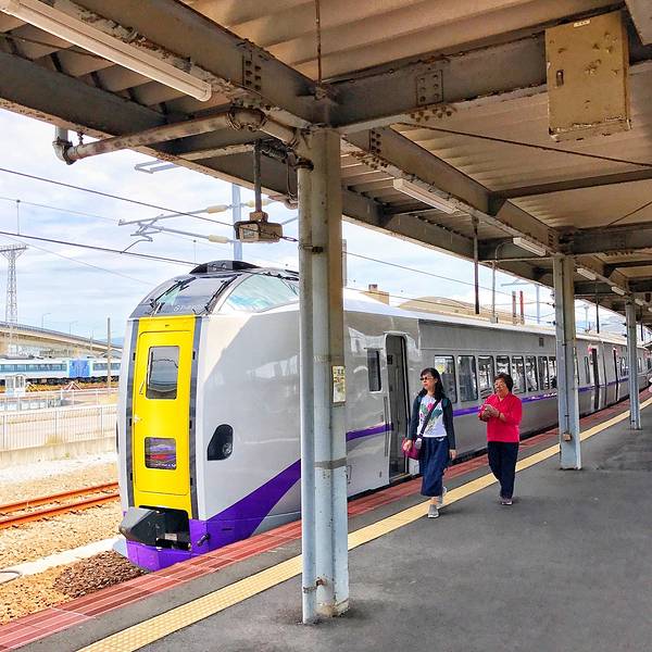 返回酒店拿上行李前往JR站,准备前往下一个目的地洞爷湖。在函馆站的进站口旁有一个特产商店,贩卖各种零食甜品和火车便当,可以买一些在火车上吃呢。本来想试试函馆特色的乌鱼包饭,可惜时间太早还没做好,吃货表示好遗憾随便买了点东西吃,刚烤出来的小馅饼味道很不错。函馆到洞爷的车票,已经预定了指定席,但这段行程很火爆呢,没有预定到我们计划的班次,只好提前一班,而且也没有靠海位置了。准备进站,按车票显示的车型找到对应站台。列车已经在站台等我们啦座位前面有一个放票的地方,方便乘客休息时列车员进行检票,很贴心呢,唯一要注意的是下车前记得把票拿下来收好,出站口还需要再次检票。列车启动,这段路程时间不长,大概一个半小时。路上的风景特别美,左侧是田园高山。