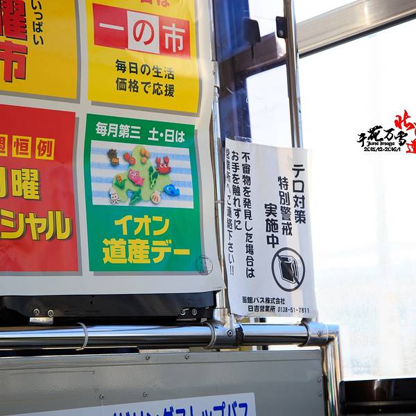 事先和酒店确认过巴士的乘车地点和1月1日的班次,工作人员亲自打了电话给公交公司确认。所以,骏爷和京京安心地退房朝公交车站走去。路上的商店都没有开门,猴年的气氛却已经很浓烈。就在这个公交车站等巴士就好...事先和酒店确认过巴士的乘车地点和1月1日的班次,工作人员亲自打了电话给公交公司确认。所以,骏爷和京京安心地退房朝公交车站走去。路上的商店都没有开门,猴年的气氛却已经很浓烈。就在这个公交车站等巴士就好,离法华就两三分钟步程。即使没有事先查好,公交车站上也有详细的时刻表,大家事先确认下就好。晒晒太阳,等巴士~~北海道最后暖洋洋的时光······市铁和巴士一起来了。看图学习下北海道的各地的特产。函馆是章鱼。札幌是猪,难道是成吉思汗烤肉吗?